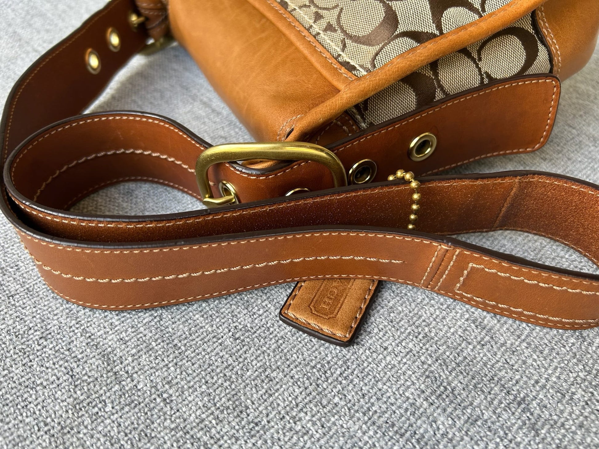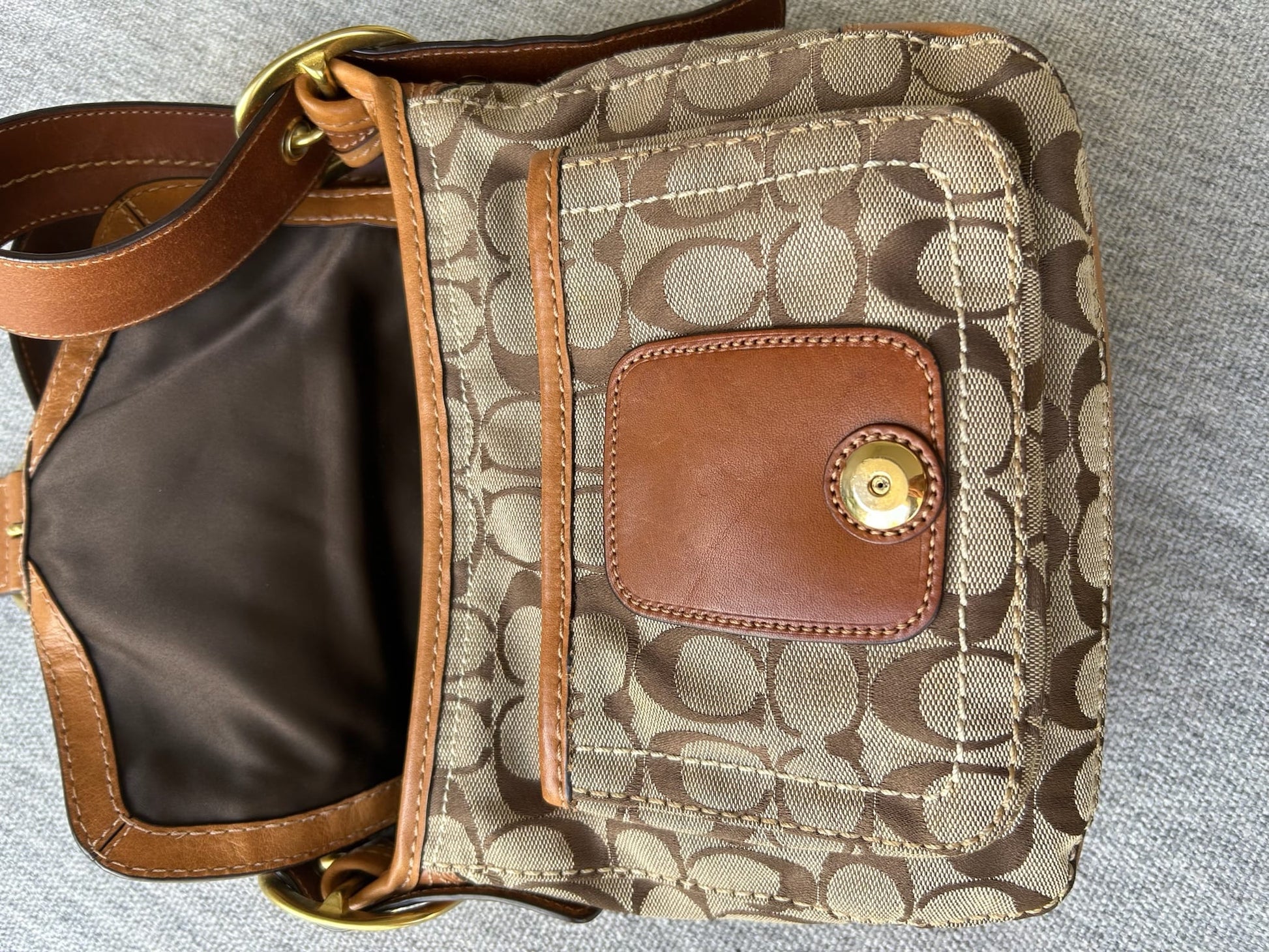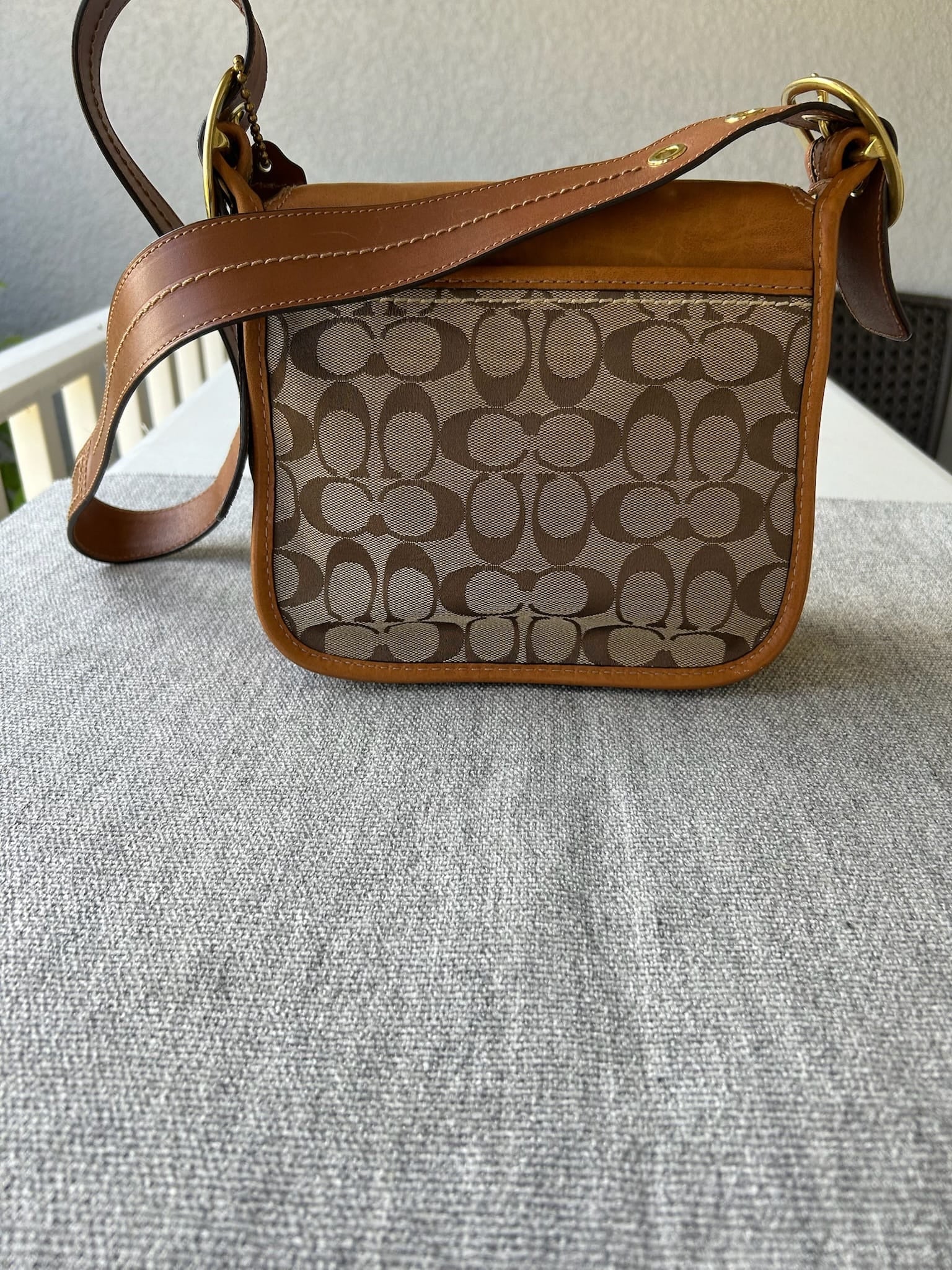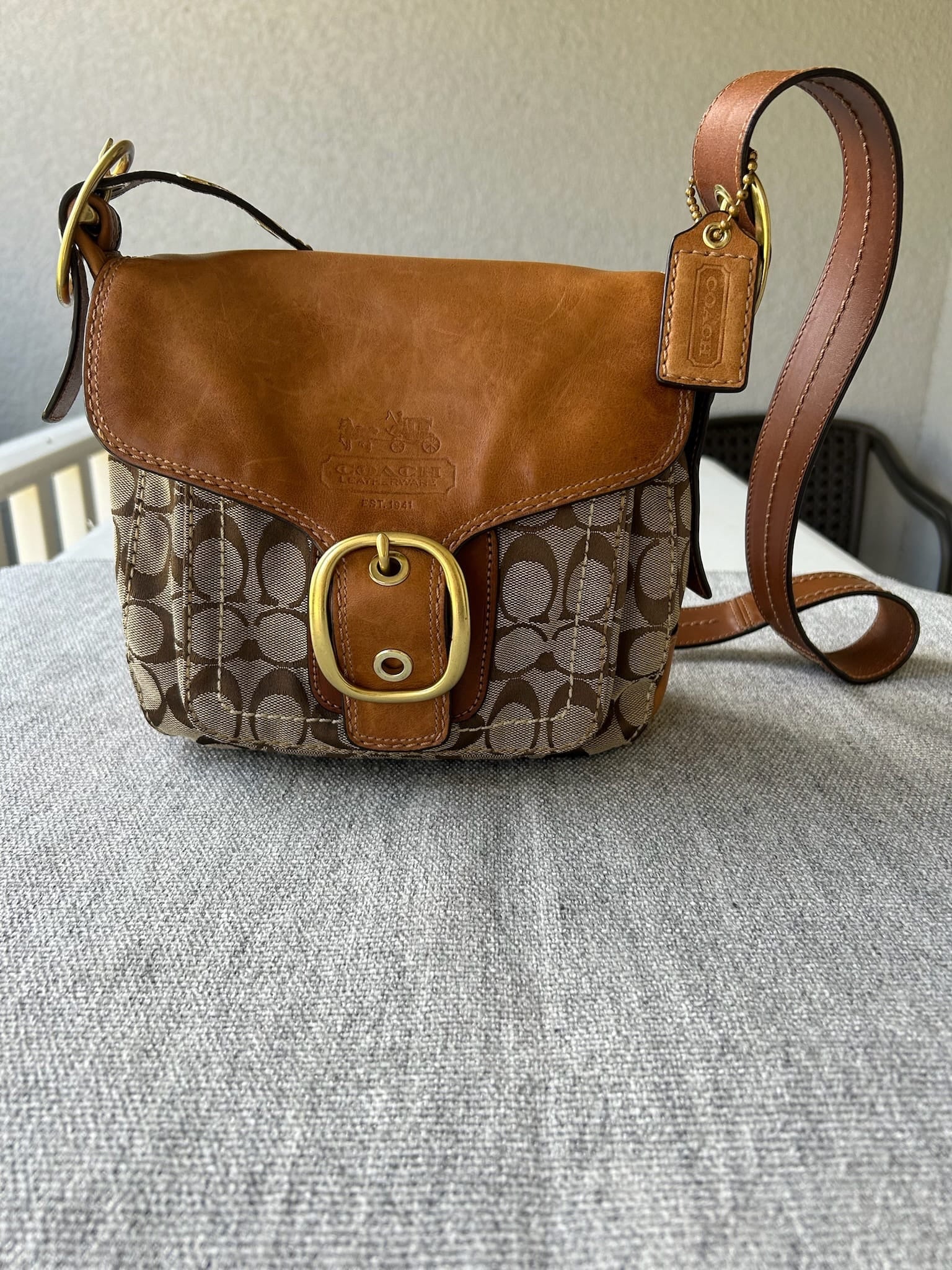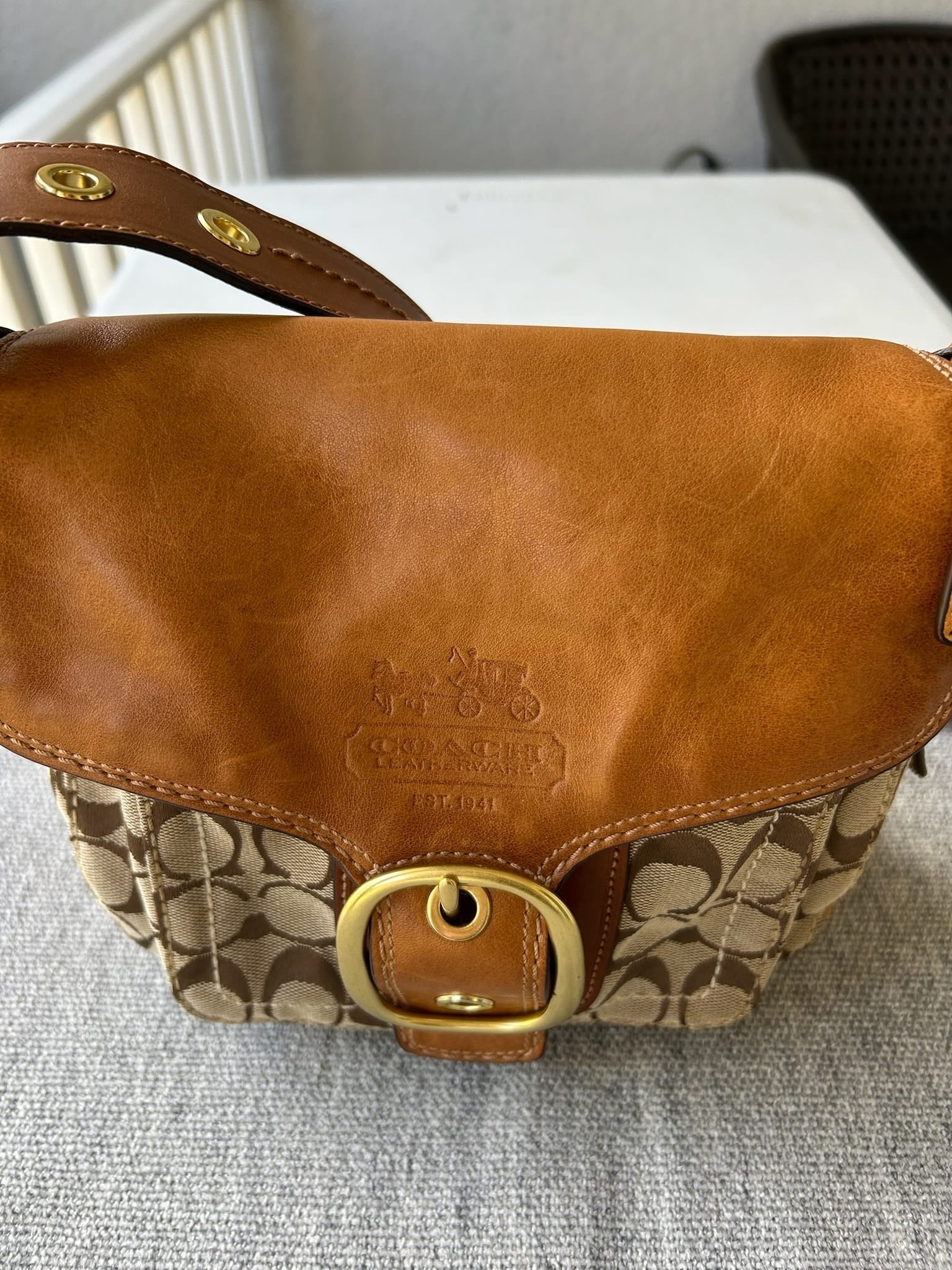 Coach crossbody bag in brown and tan. Perfect for everyday use with a chic design. This item is in good used condition with minor signs of wear consistent with its age. Any notable flaws will be detailed in this description, and any additional call outs if any, can be seen in the provided photos. Please review all images carefully. Leather has scratches, item has been conditioned. Inside is clean.