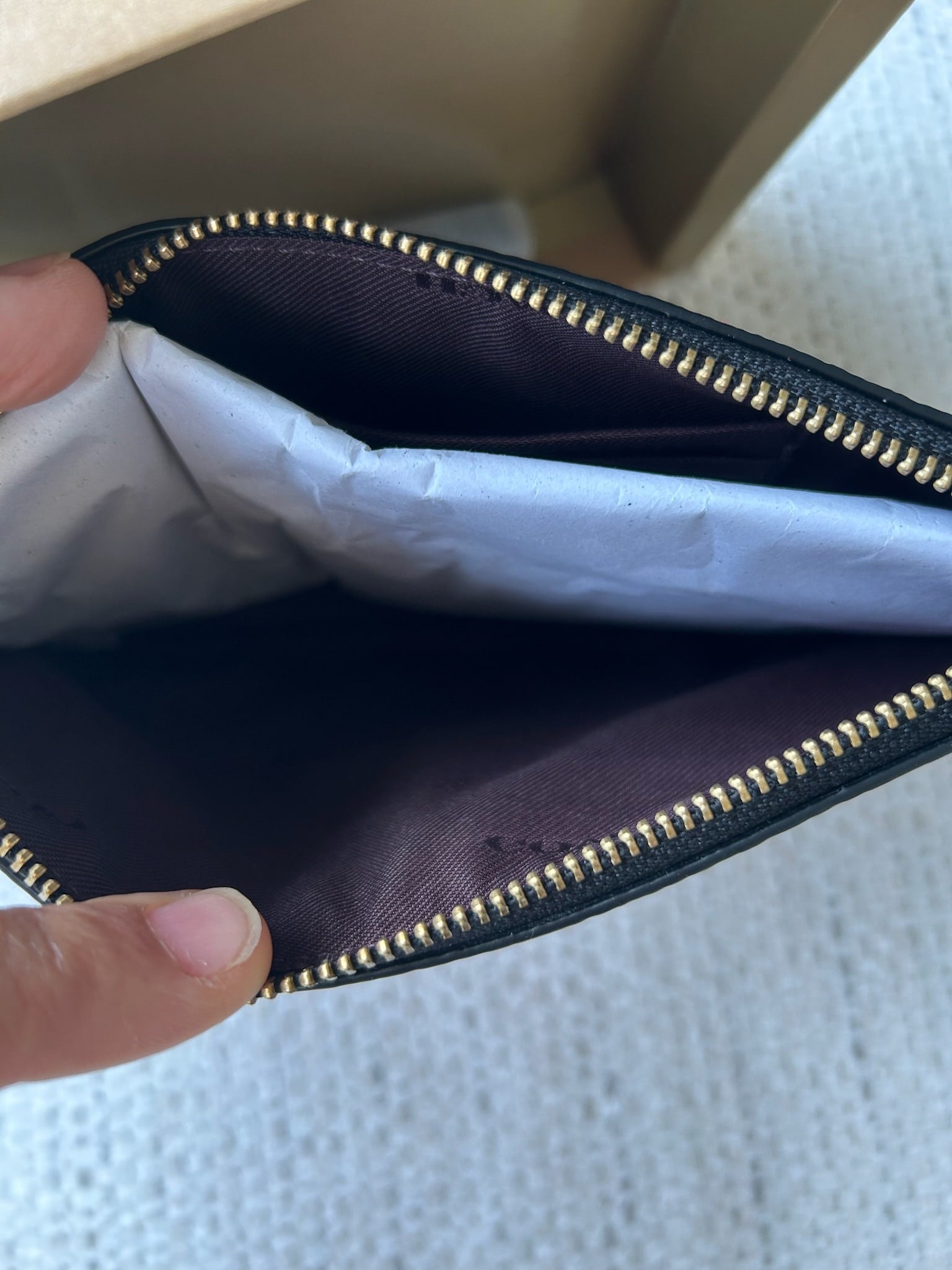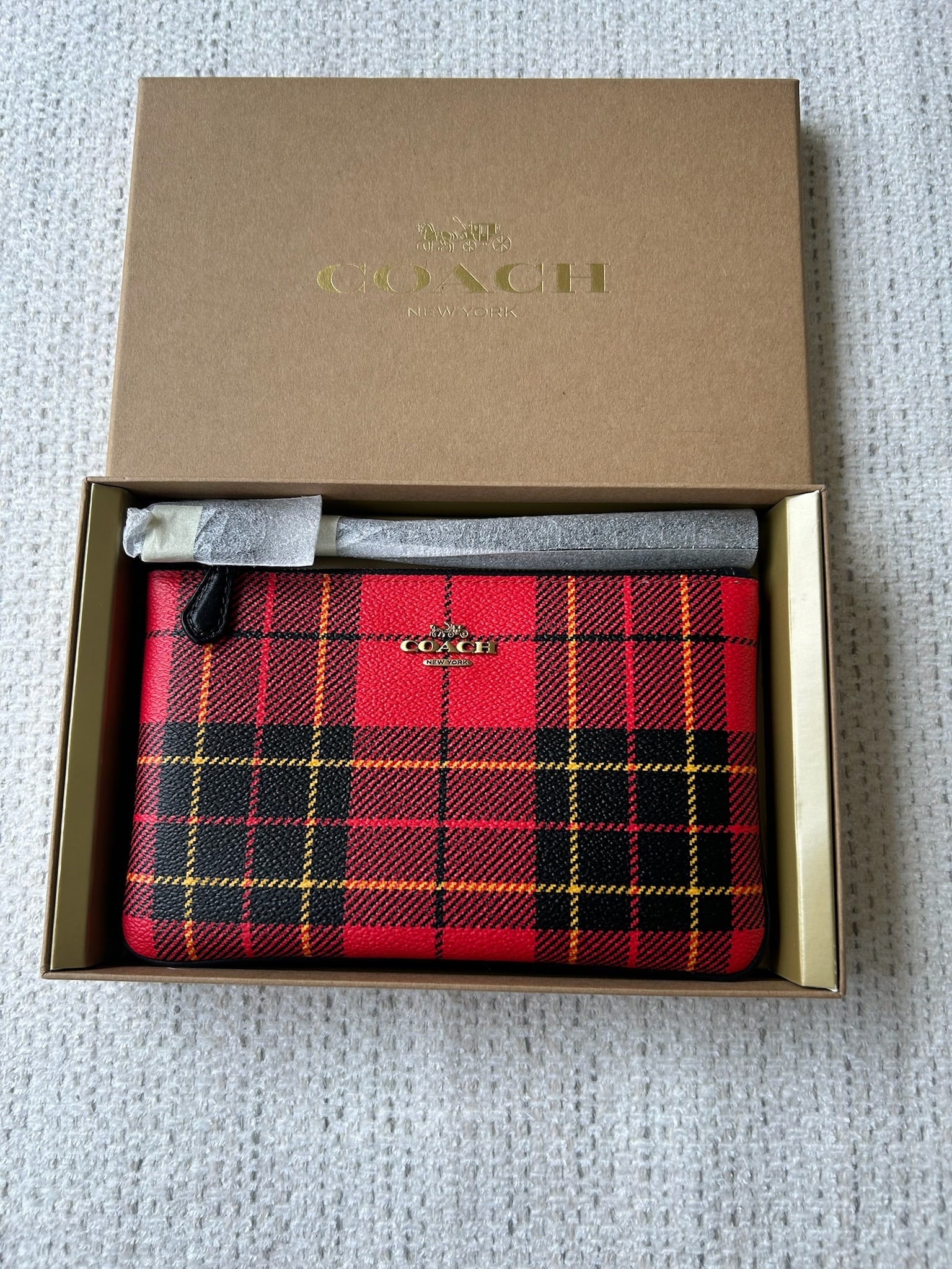 Stylish red plaid wristlet by Coach. Features a classic design with a convenient wrist strap. This item is new and unused.