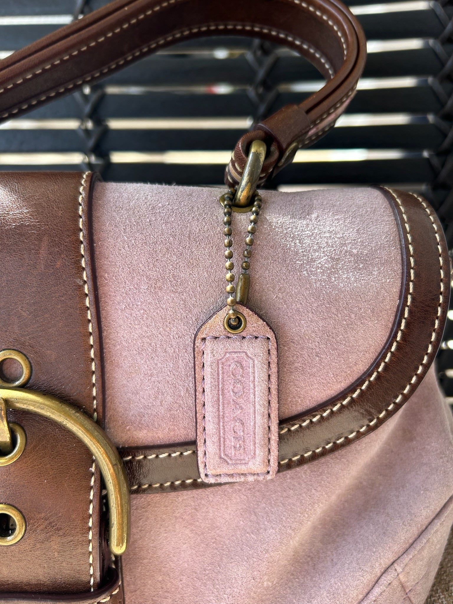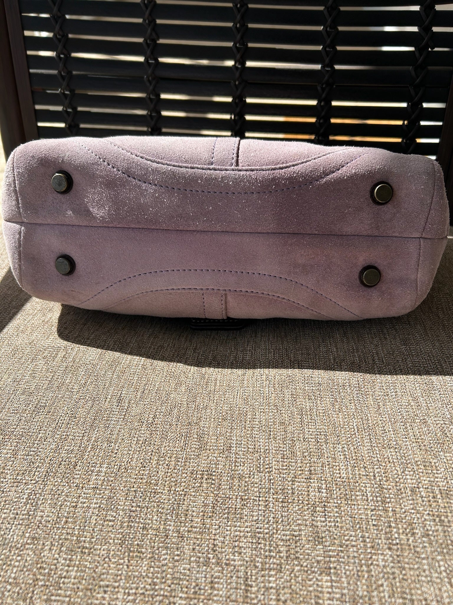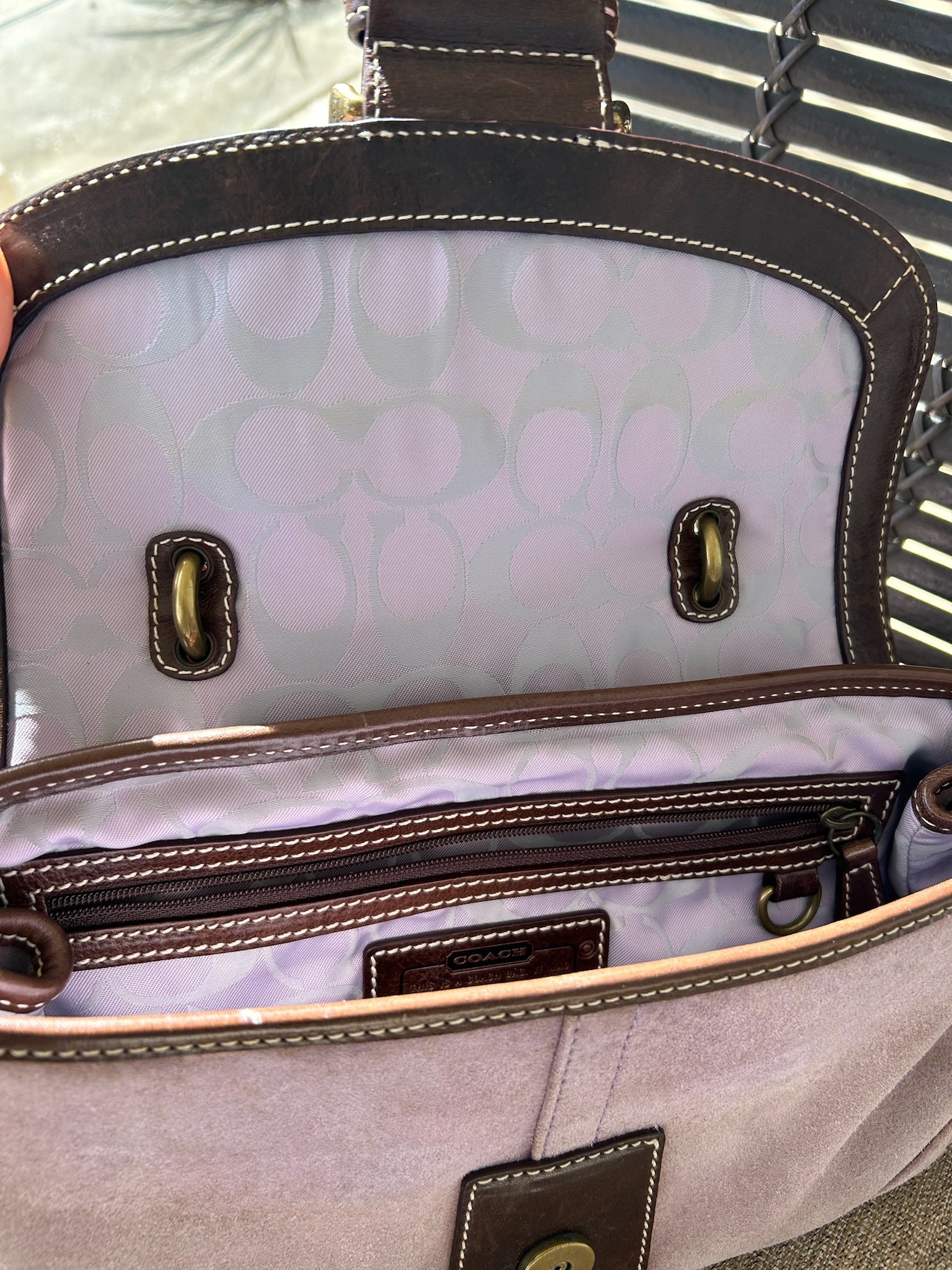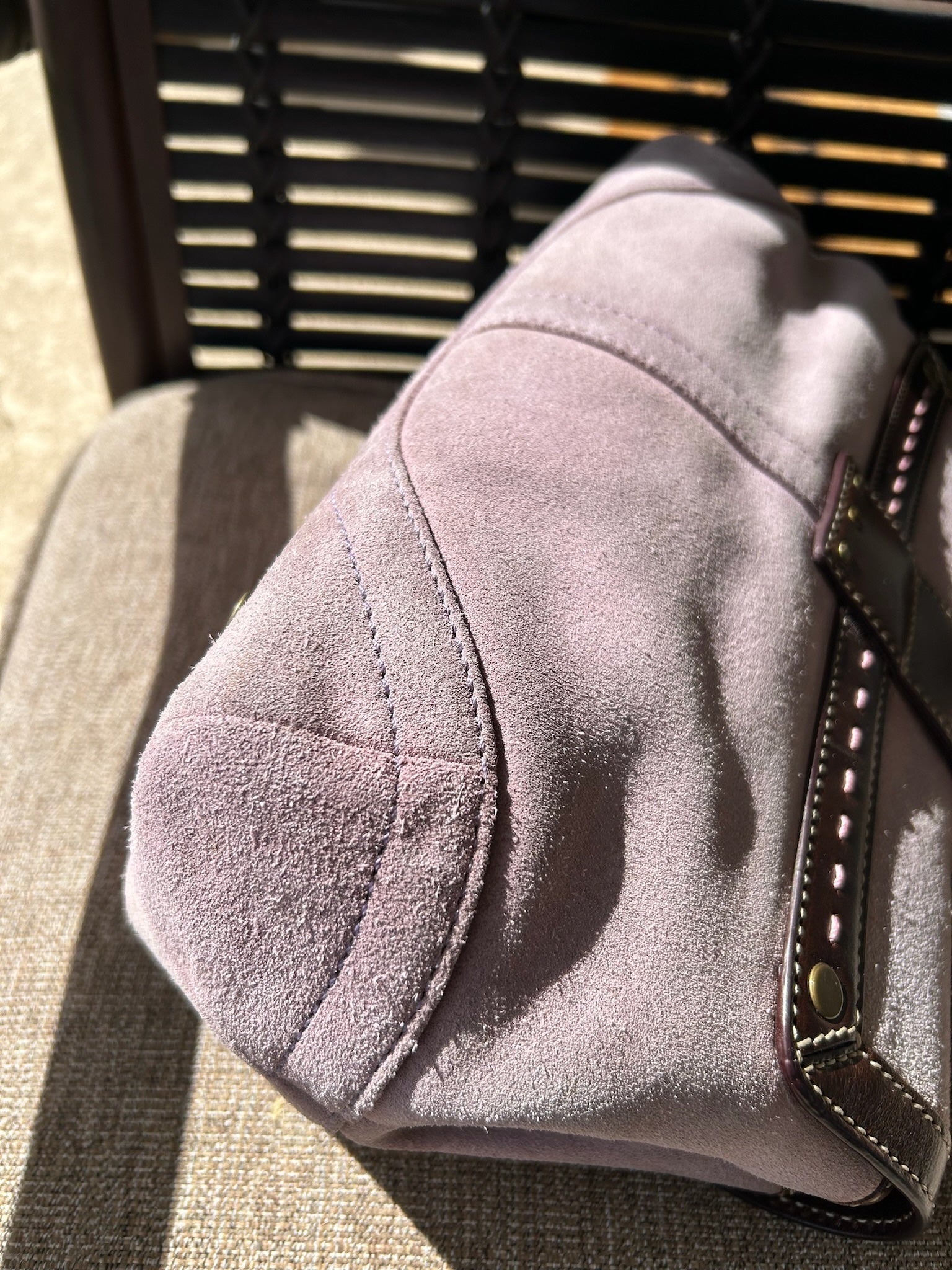 Condition, Positives, Flaws, Items to Note: Bag has stains at corners and discoloration under flap. After using suede brush and suede cleaner, I got a little too vigorous with the scrubbing. What looks like spots is actually the brown leather coming through. Sorry, I’m heavy-handed. Inside clean. Any repairs, cleaning/conditioning products used, dunking, etc: Bag has been cleaned with suede cleaner and suede brush. Leather parts were conditioned with leather CPR. No coloring: no No dunking, paint, dye, shoe polish or shoe crème. No odor. Preventative measure: all bags are spritzed/wiped with either white vinegar.