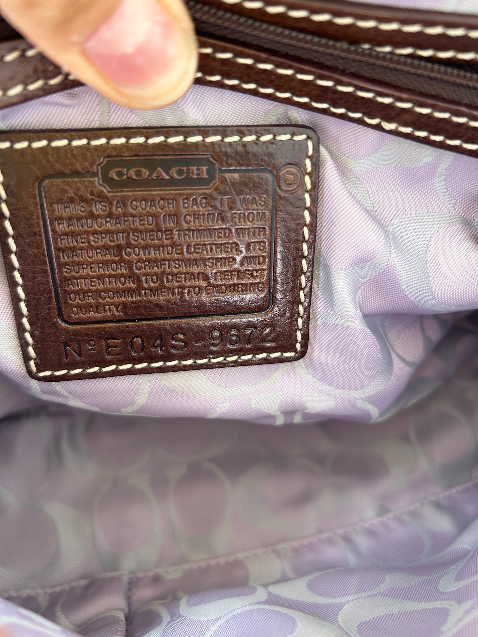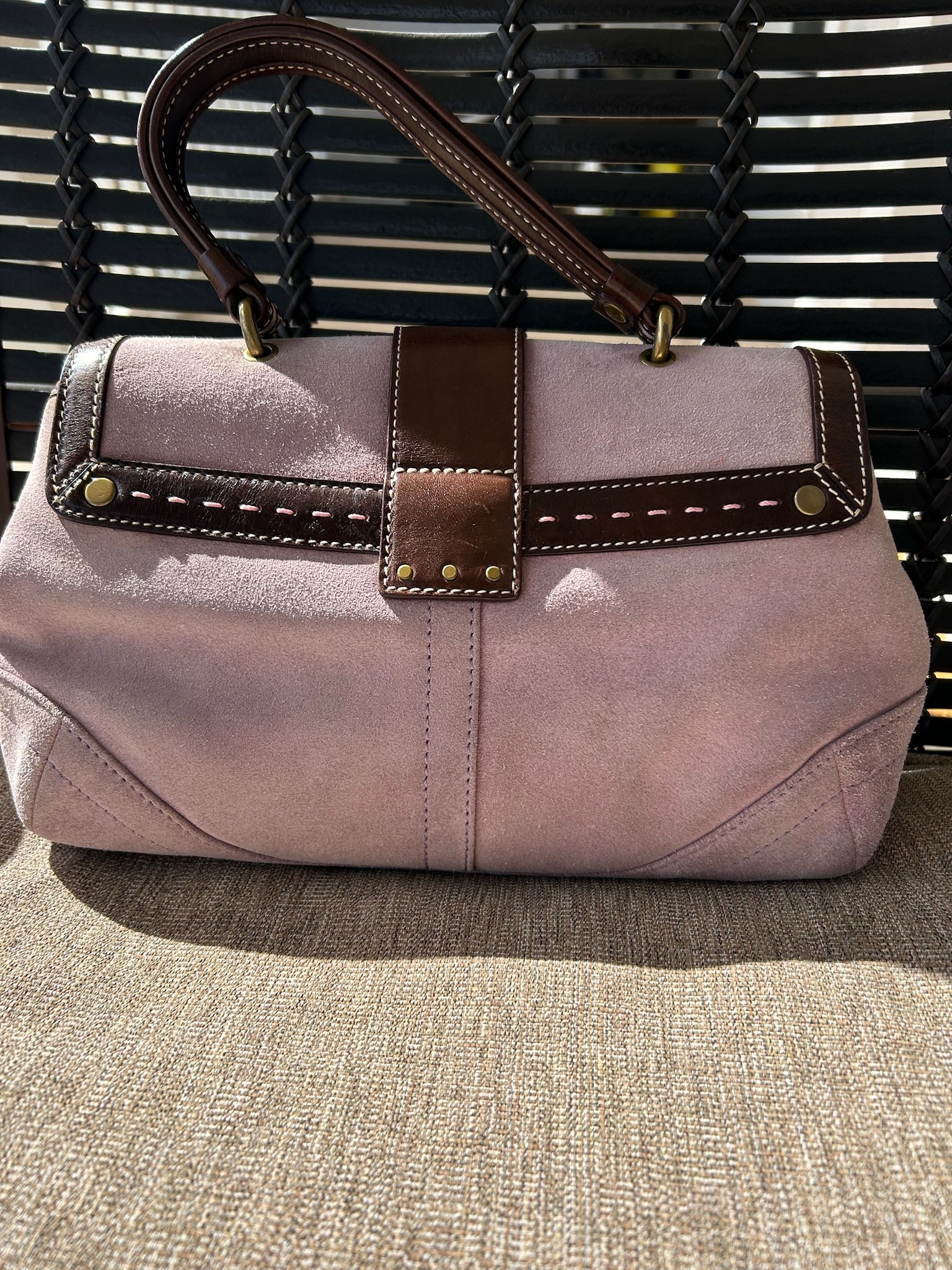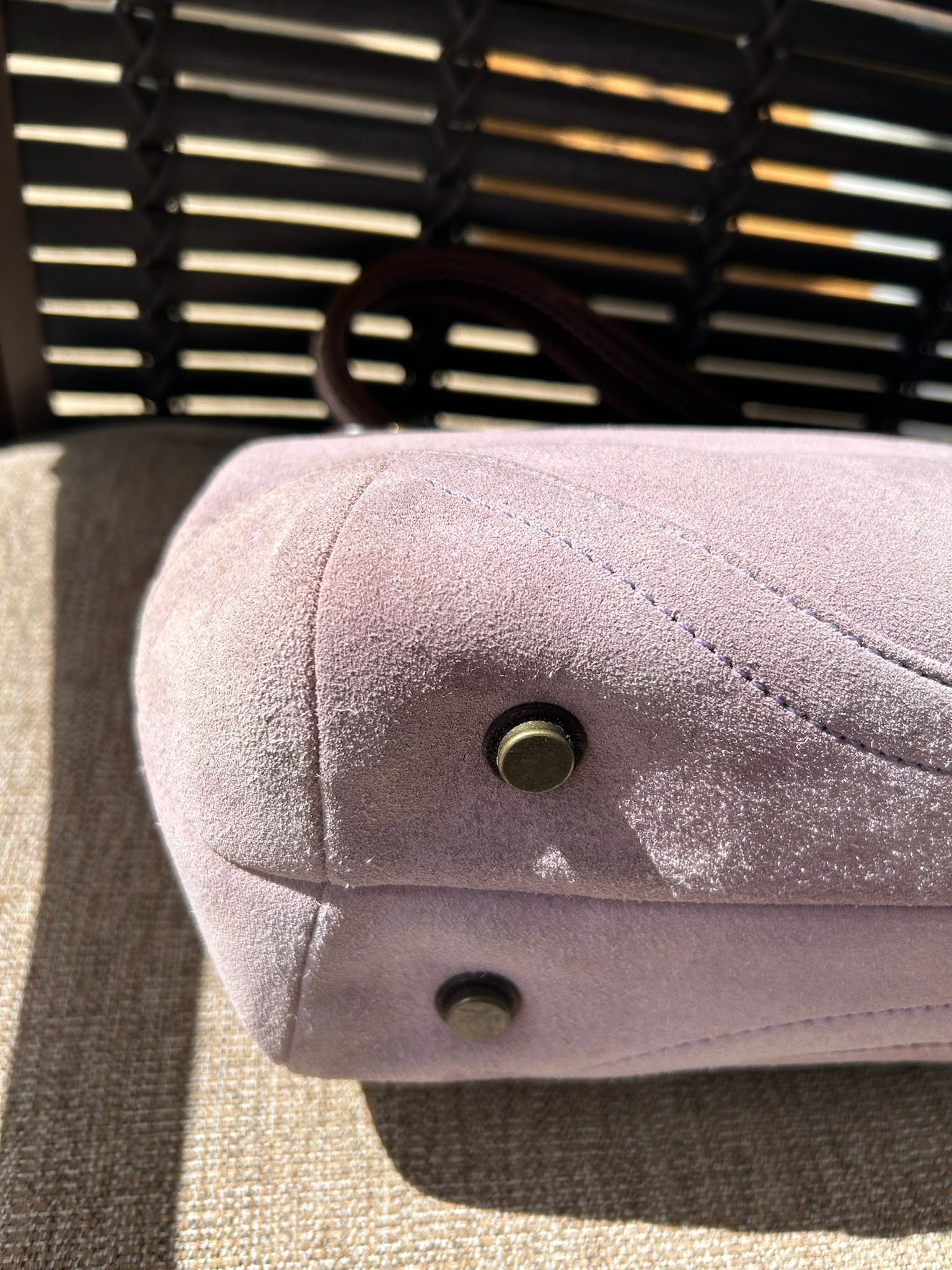 Condition, Positives, Flaws, Items to Note: Bag has stains at corners and discoloration under flap. After using suede brush and suede cleaner, I got a little too vigorous with the scrubbing. What looks like spots is actually the brown leather coming through. Sorry, I’m heavy-handed. Inside clean. Any repairs, cleaning/conditioning products used, dunking, etc: Bag has been cleaned with suede cleaner and suede brush. Leather parts were conditioned with leather CPR. No coloring: no No dunking, paint, dye, shoe polish or shoe crème. No odor. Preventative measure: all bags are spritzed/wiped with either white vinegar.