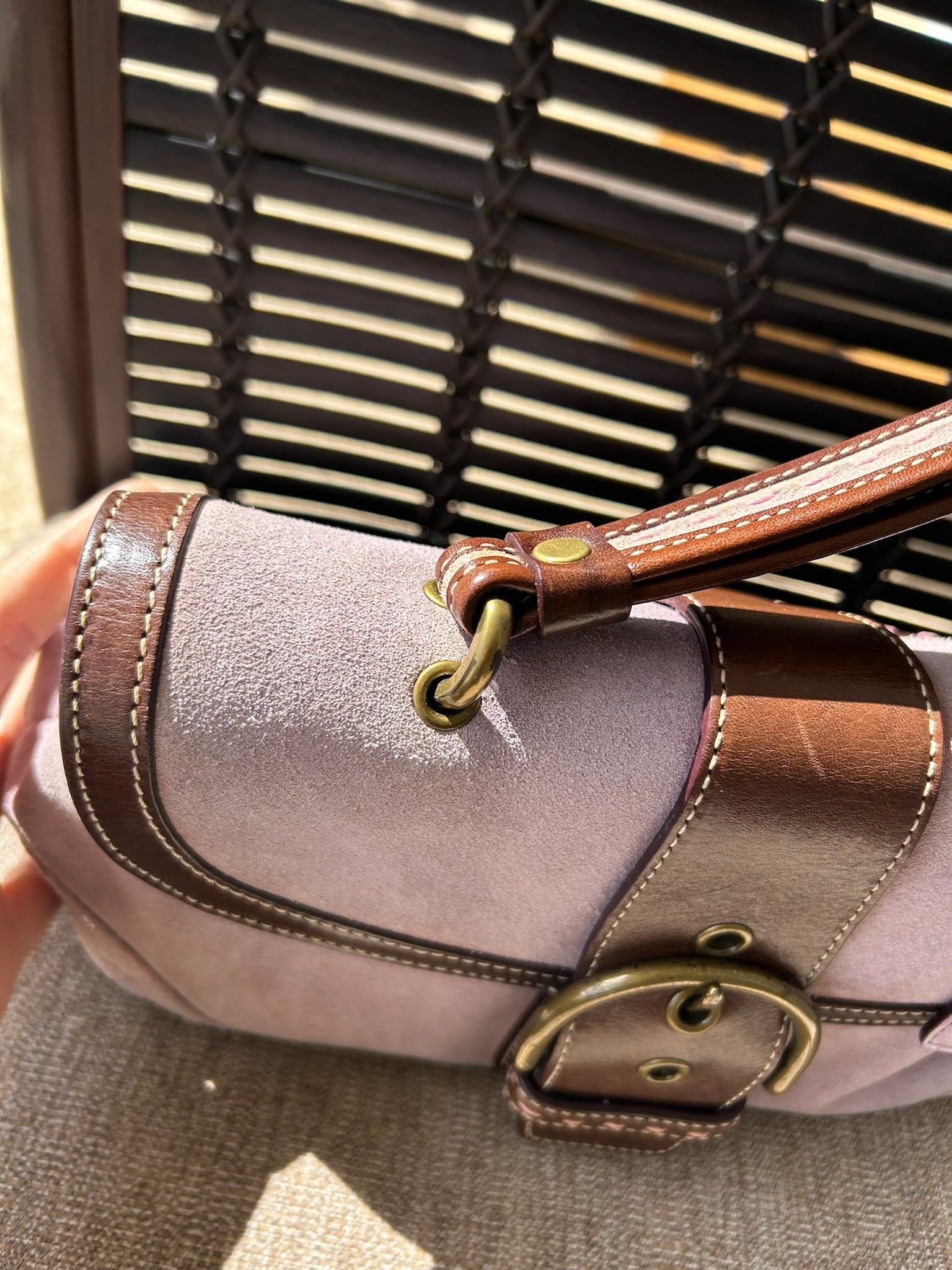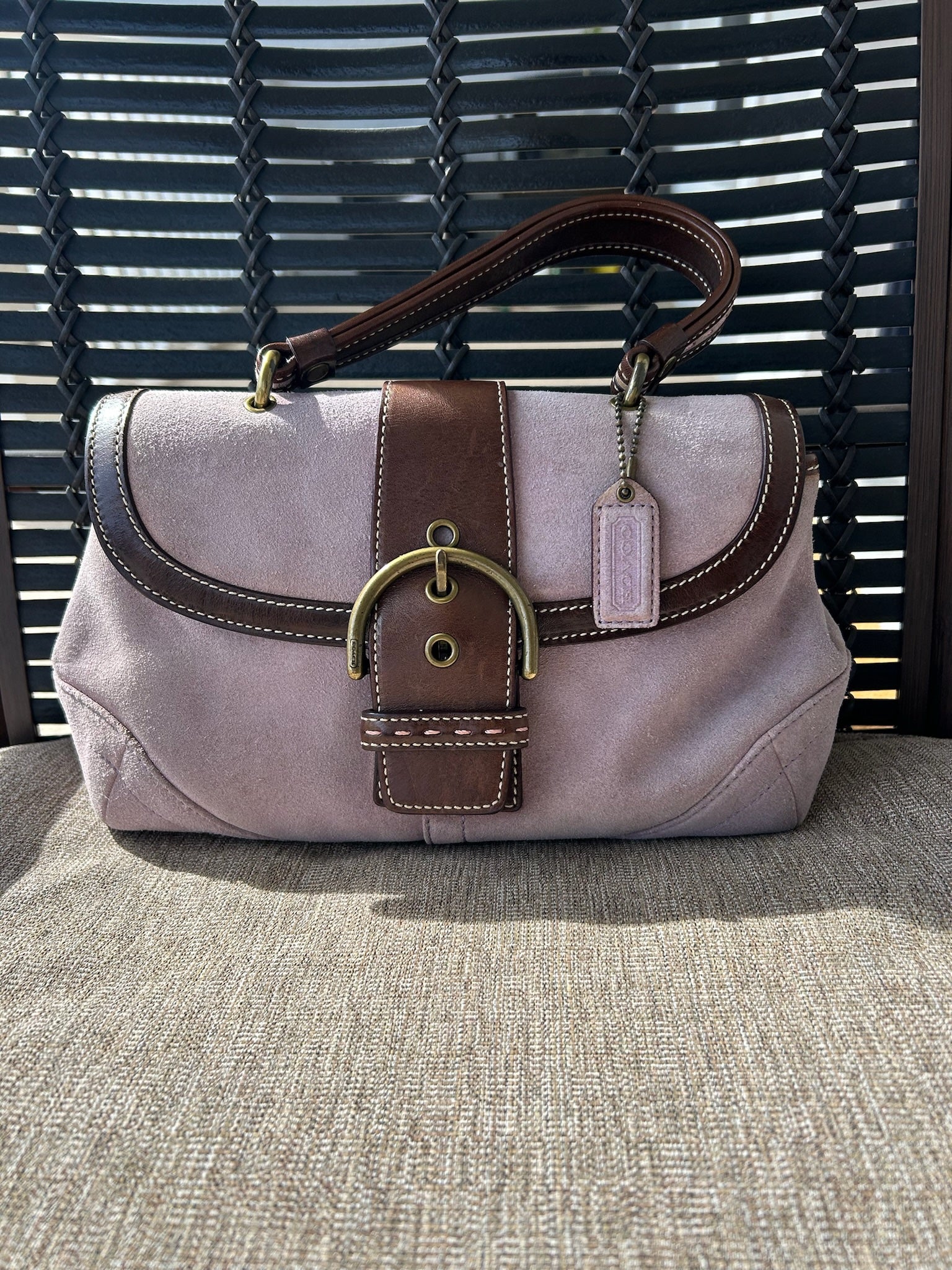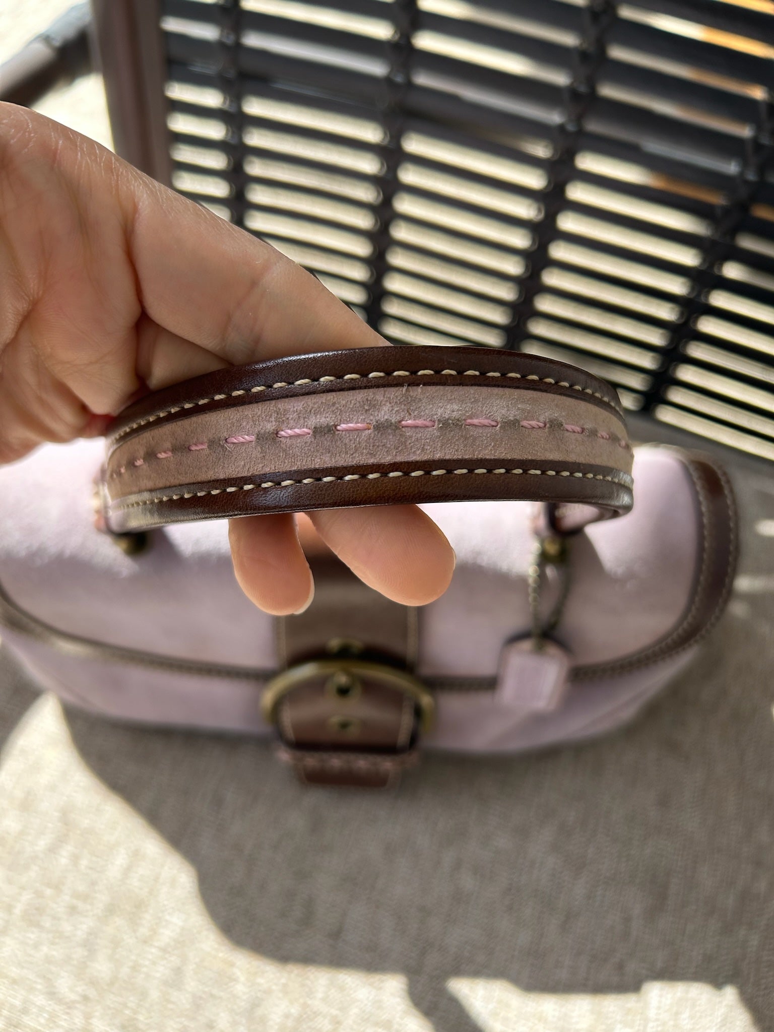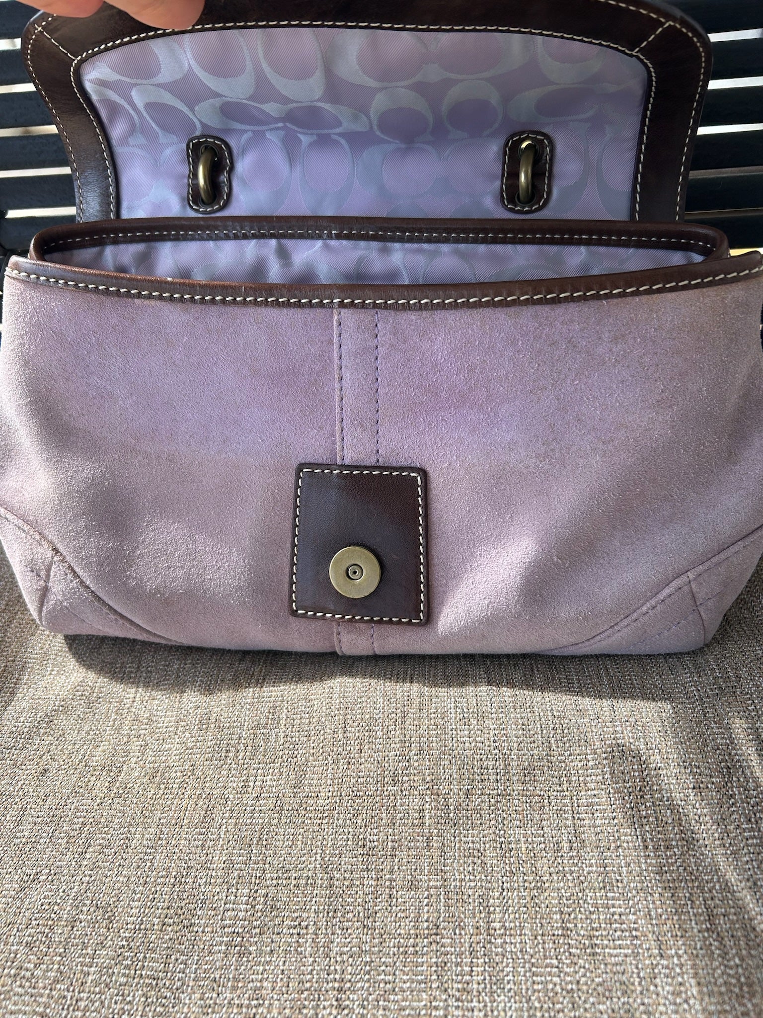 Condition, Positives, Flaws, Items to Note: Bag has stains at corners and discoloration under flap. After using suede brush and suede cleaner, I got a little too vigorous with the scrubbing. What looks like spots is actually the brown leather coming through. Sorry, I’m heavy-handed. Inside clean. Any repairs, cleaning/conditioning products used, dunking, etc: Bag has been cleaned with suede cleaner and suede brush. Leather parts were conditioned with leather CPR. No coloring: no No dunking, paint, dye, shoe polish or shoe crème. No odor. Preventative measure: all bags are spritzed/wiped with either white vinegar.