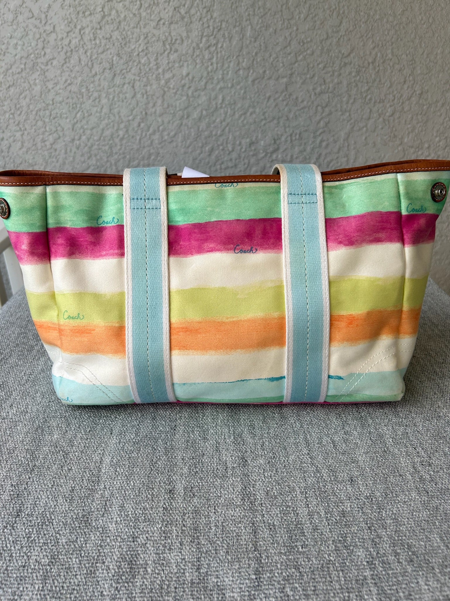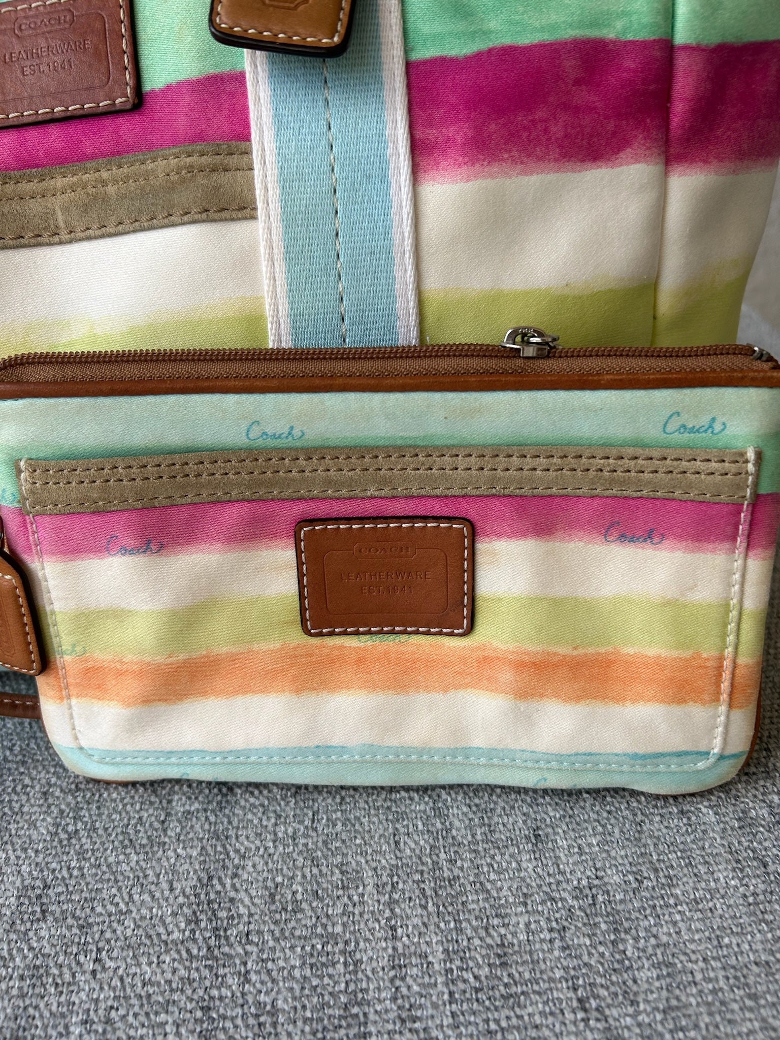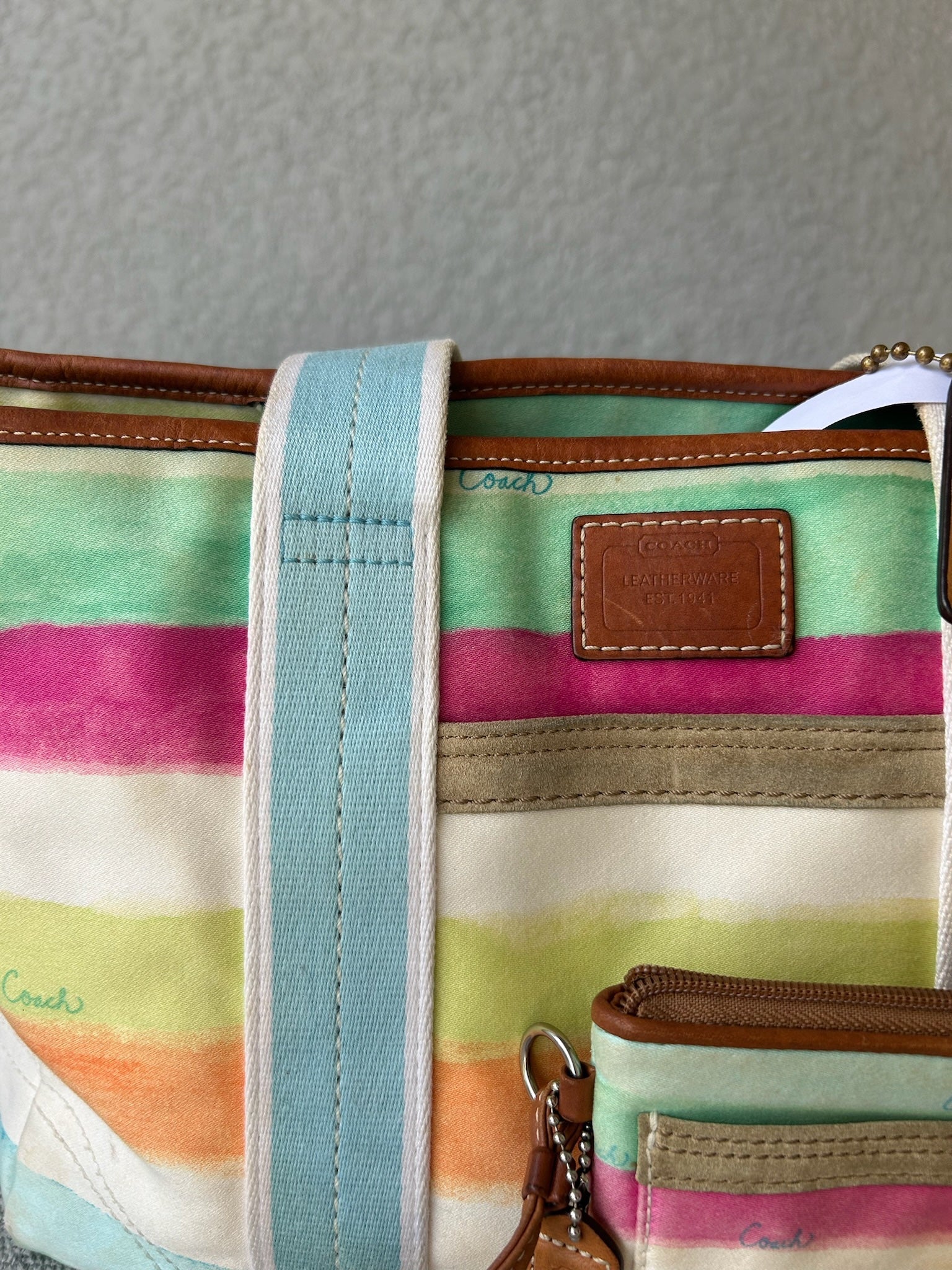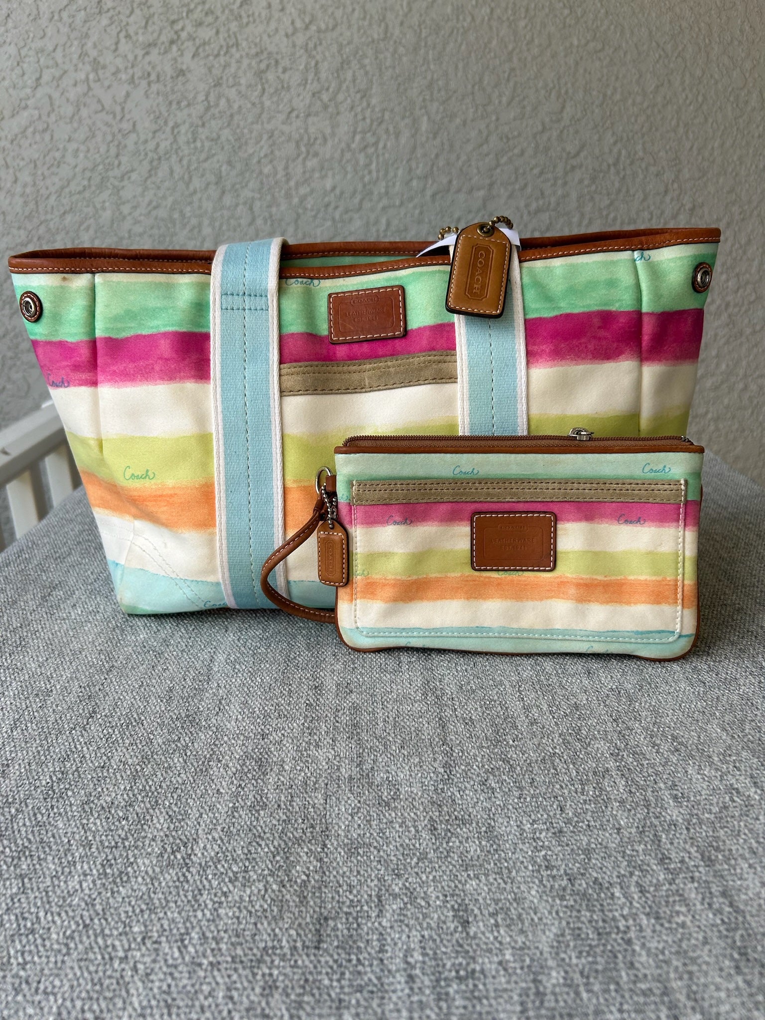 Coach water color tote bag. Bag is previously loved bag has some wear. wear can be seen at the corners on the handles, bag has some stains on handles and on bottom of bag. Inside of bag has some stains. Bag comes with matching wristlet that also has wear and staining. See pics