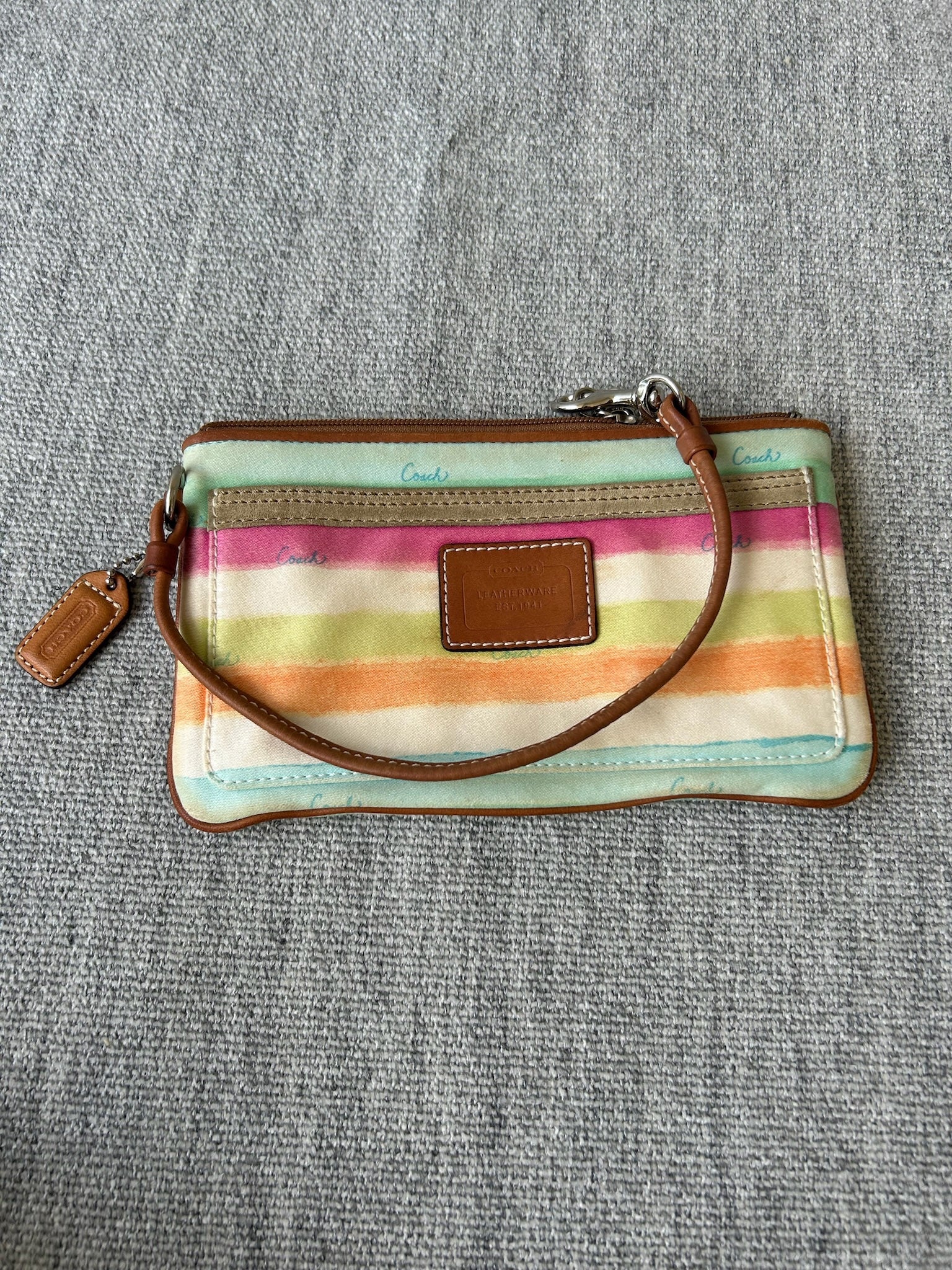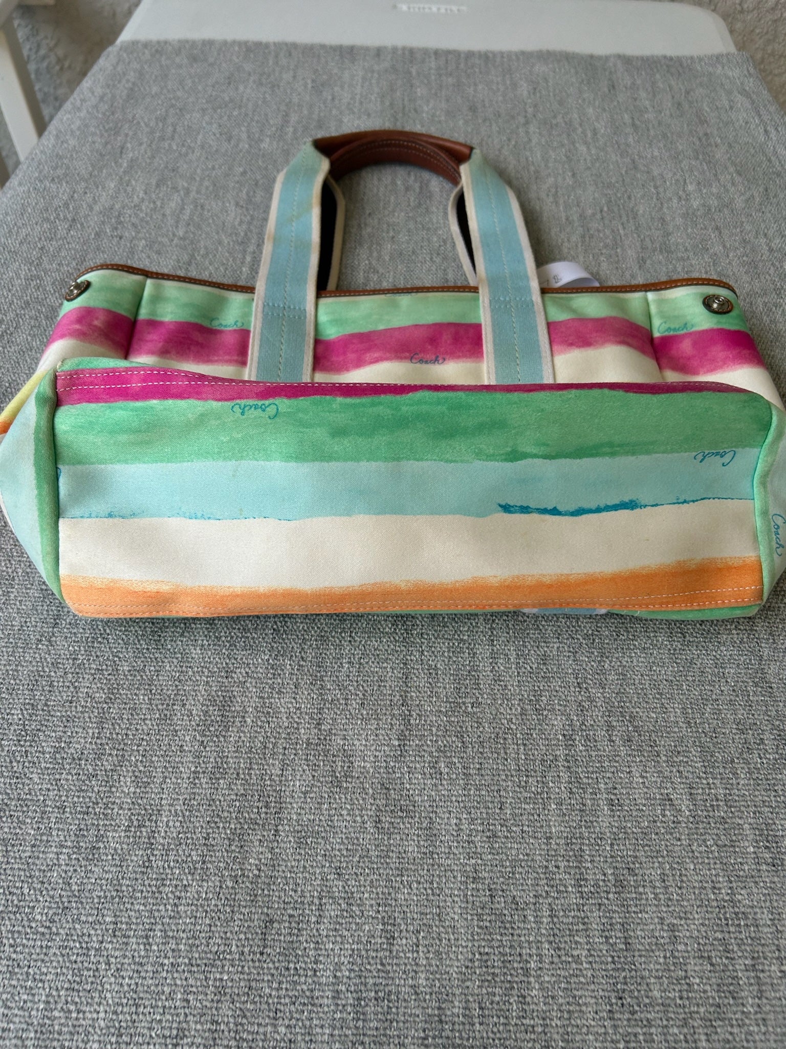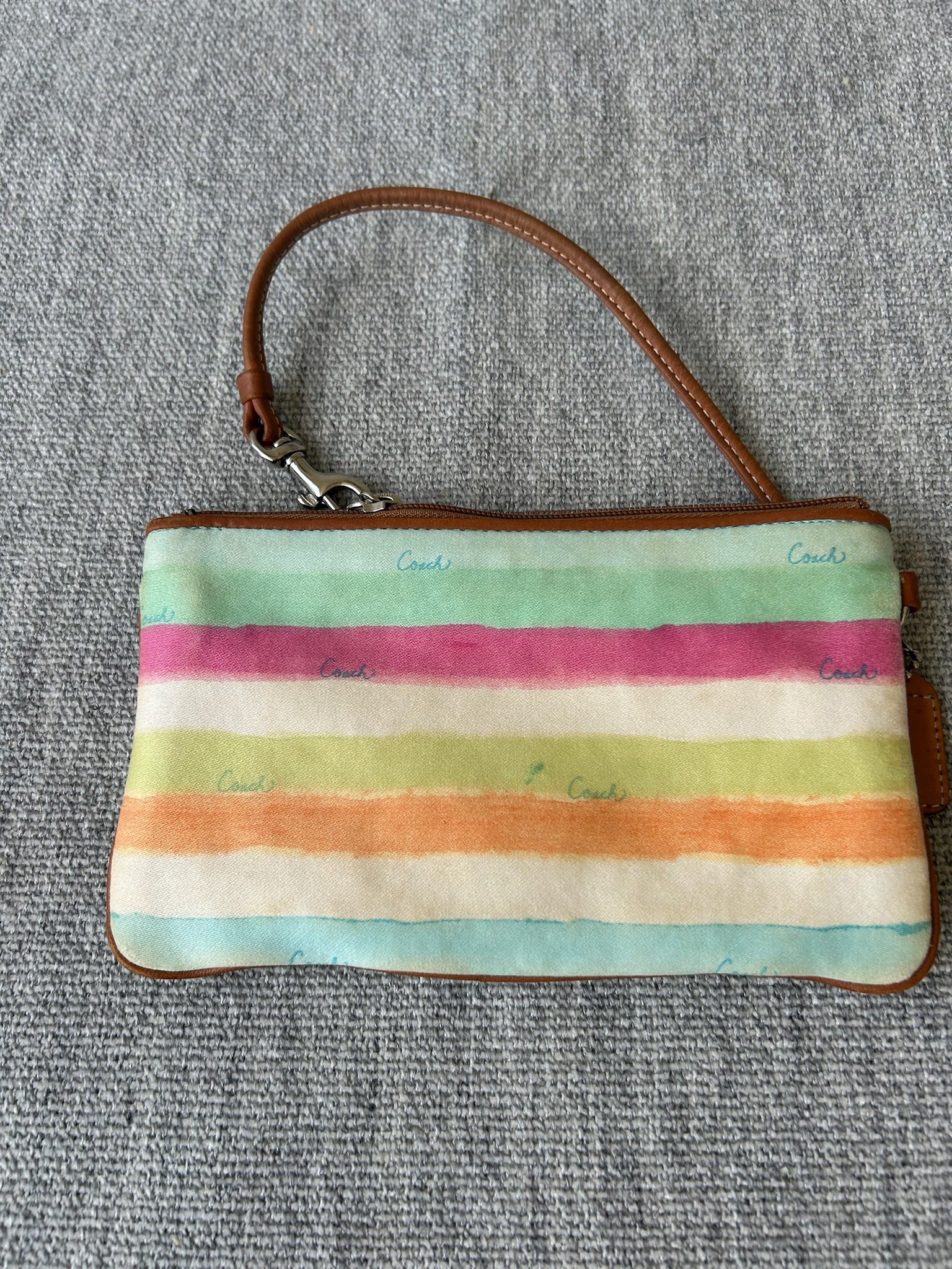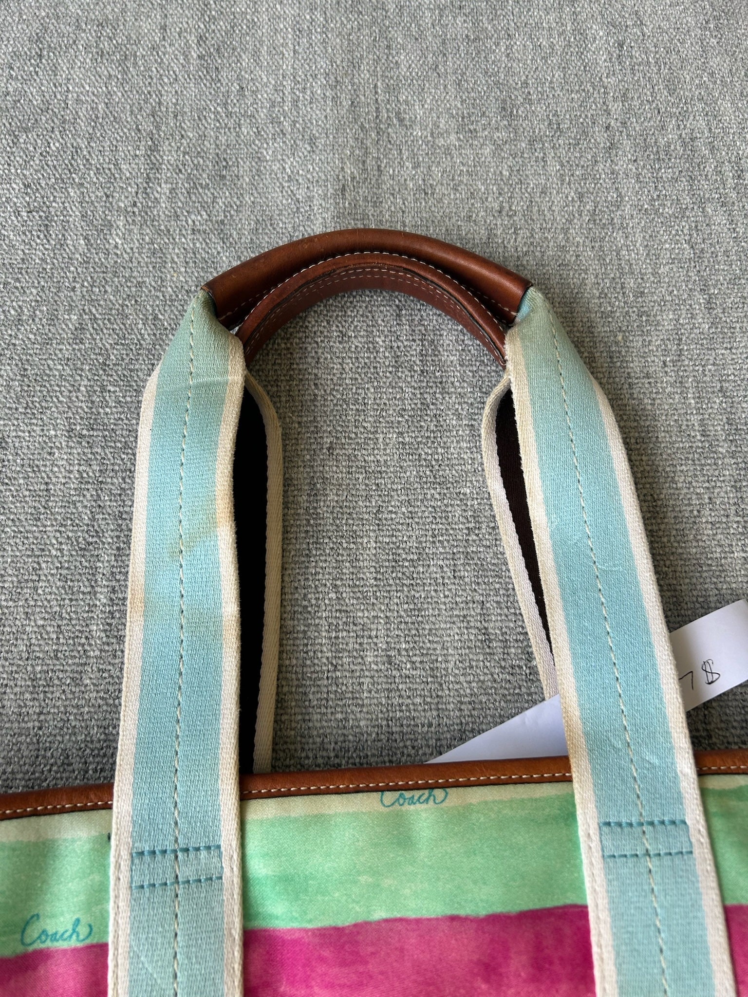 Coach water color tote bag. Bag is previously loved bag has some wear. wear can be seen at the corners on the handles, bag has some stains on handles and on bottom of bag. Inside of bag has some stains. Bag comes with matching wristlet that also has wear and staining. See pics