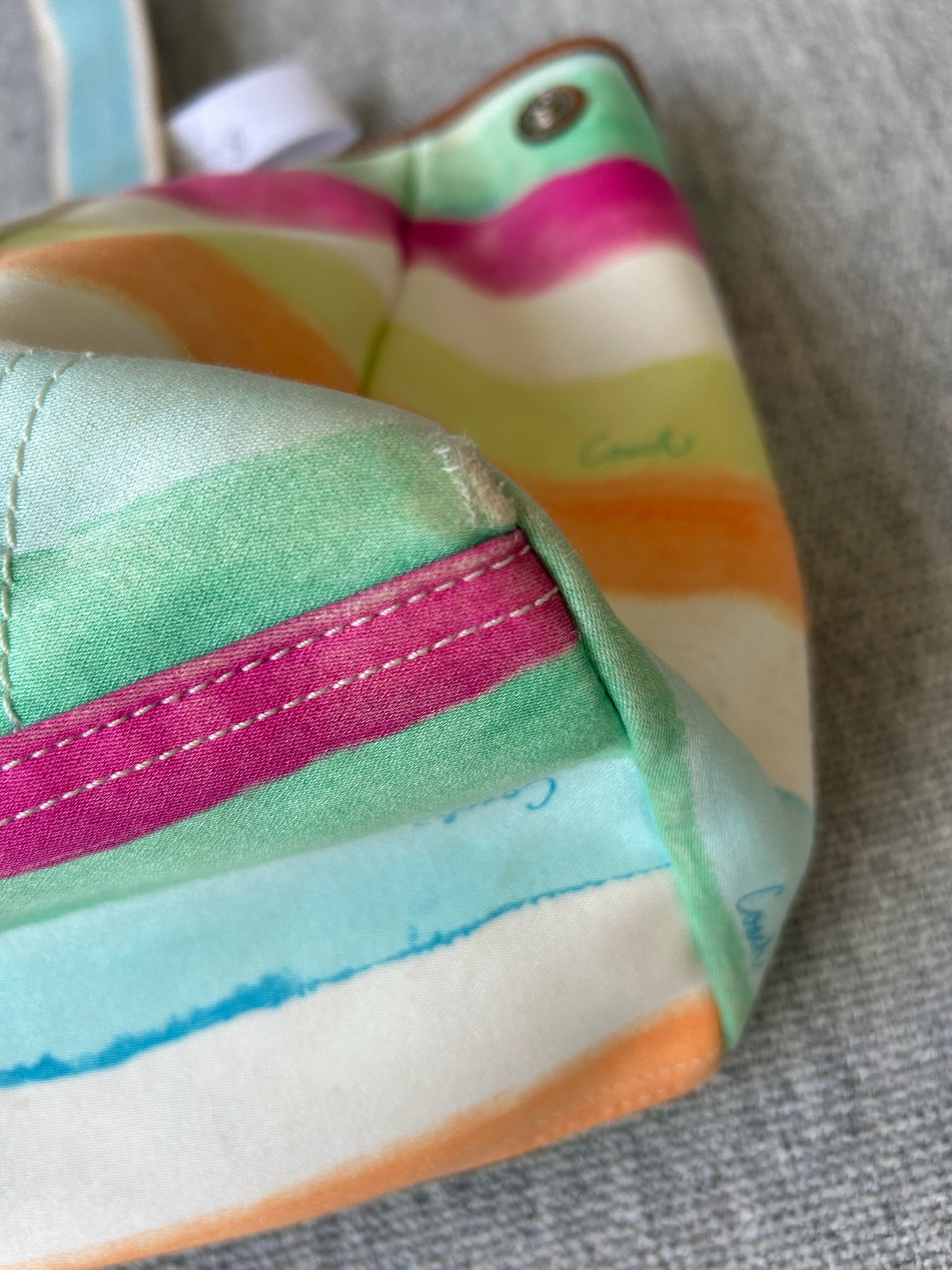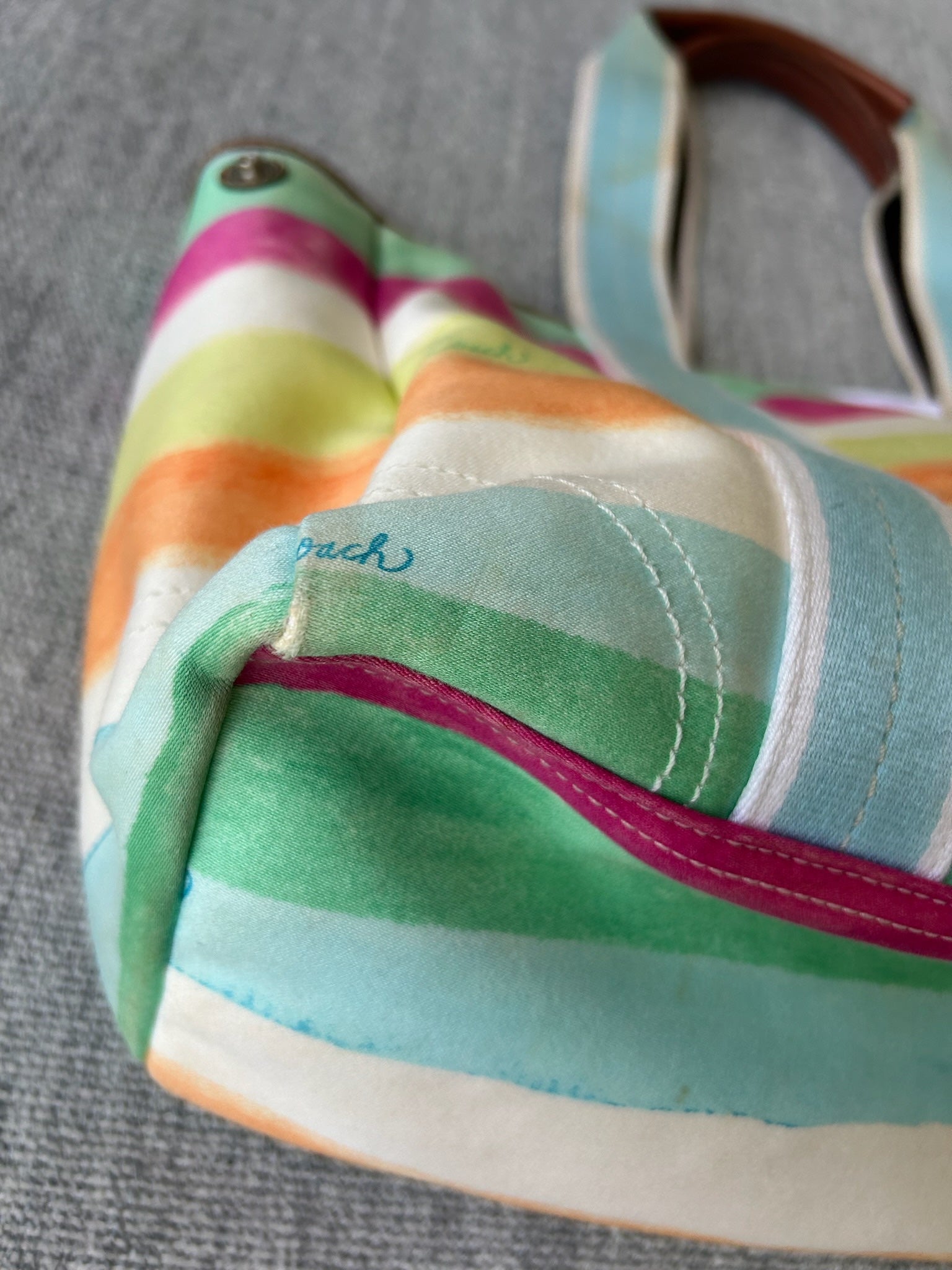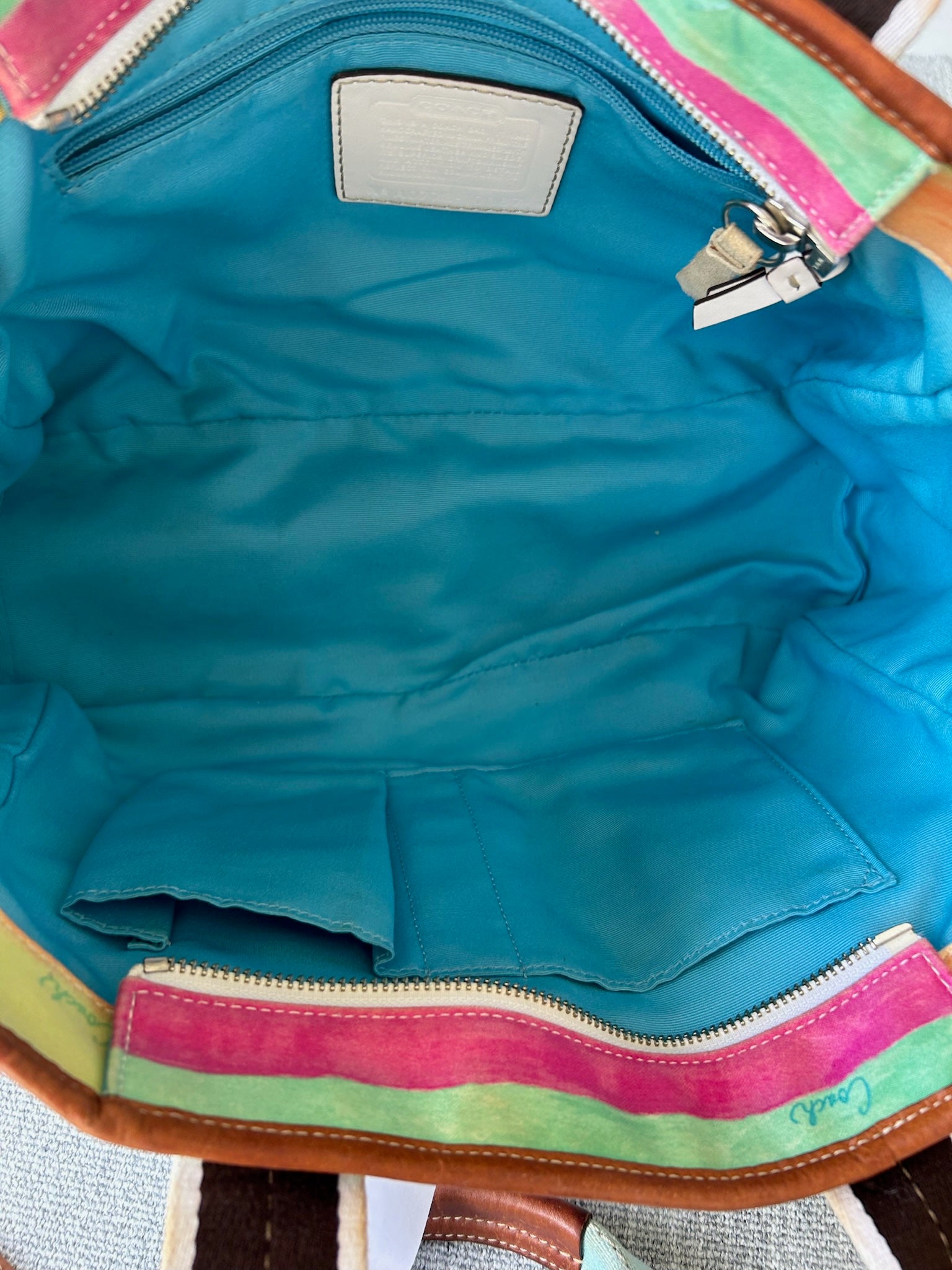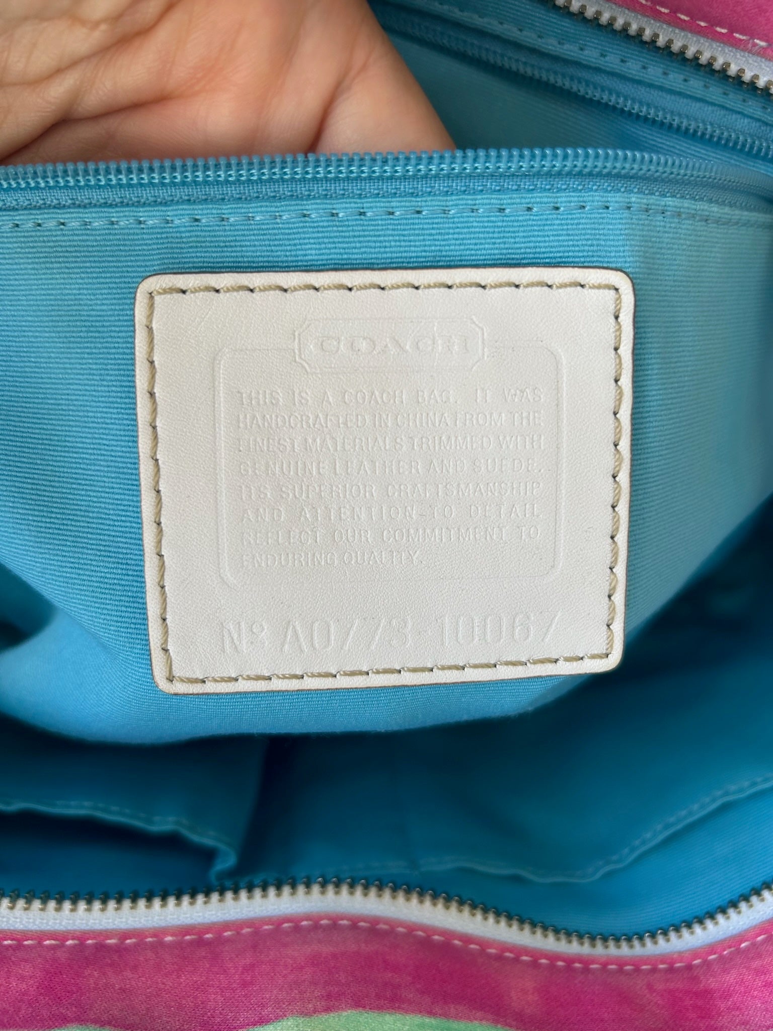 Coach water color tote bag. Bag is previously loved bag has some wear. wear can be seen at the corners on the handles, bag has some stains on handles and on bottom of bag. Inside of bag has some stains. Bag comes with matching wristlet that also has wear and staining. See pics