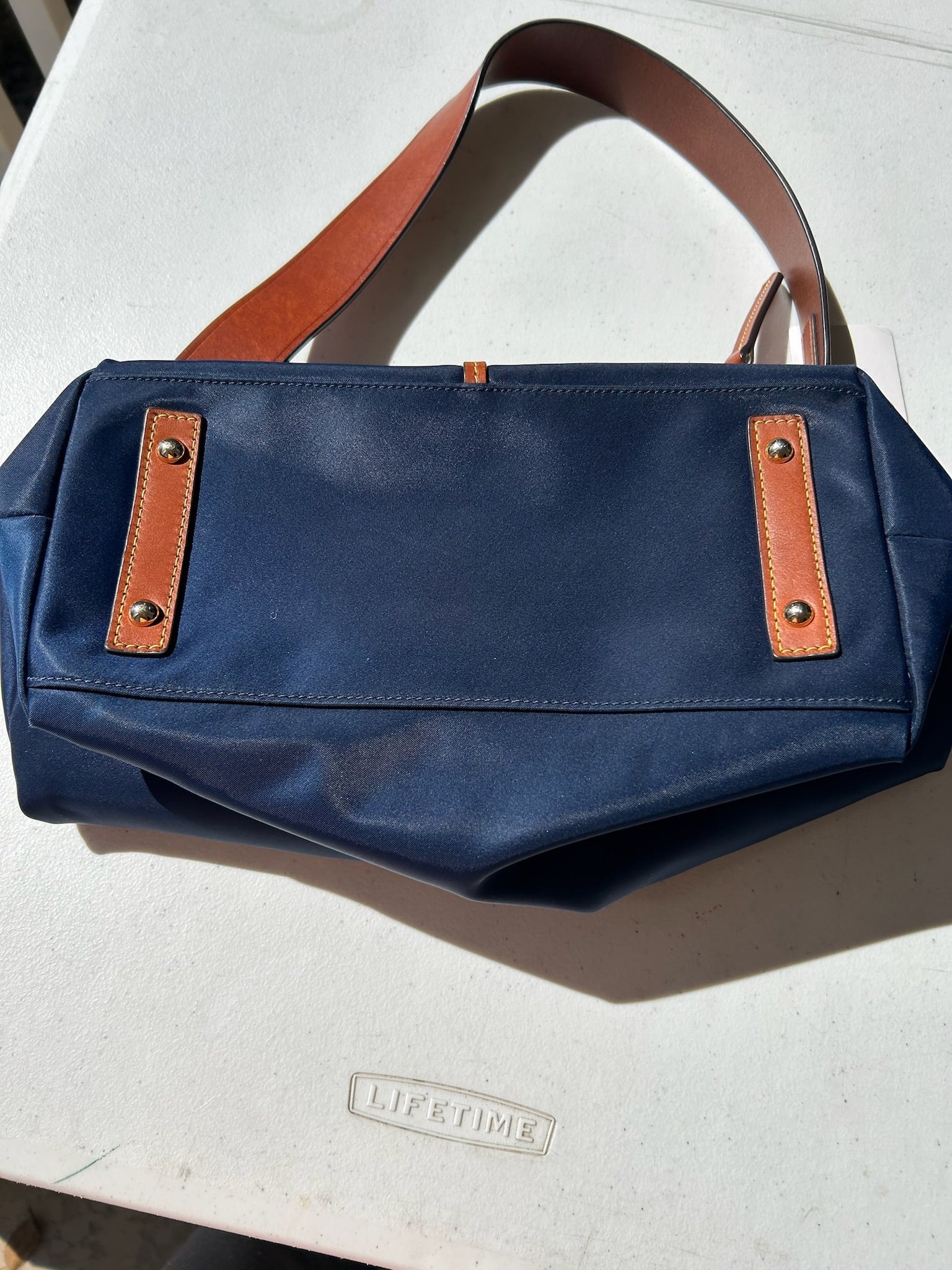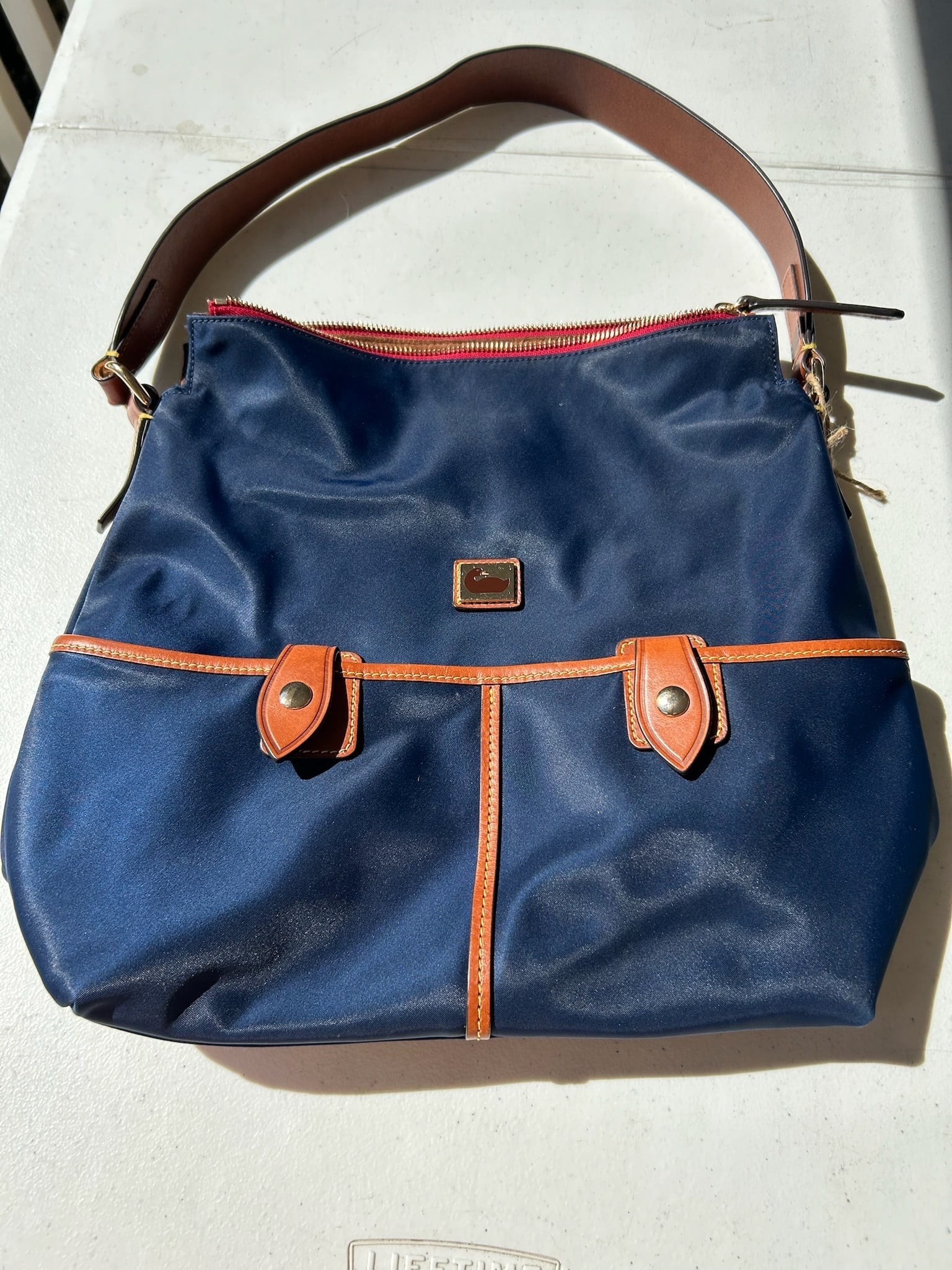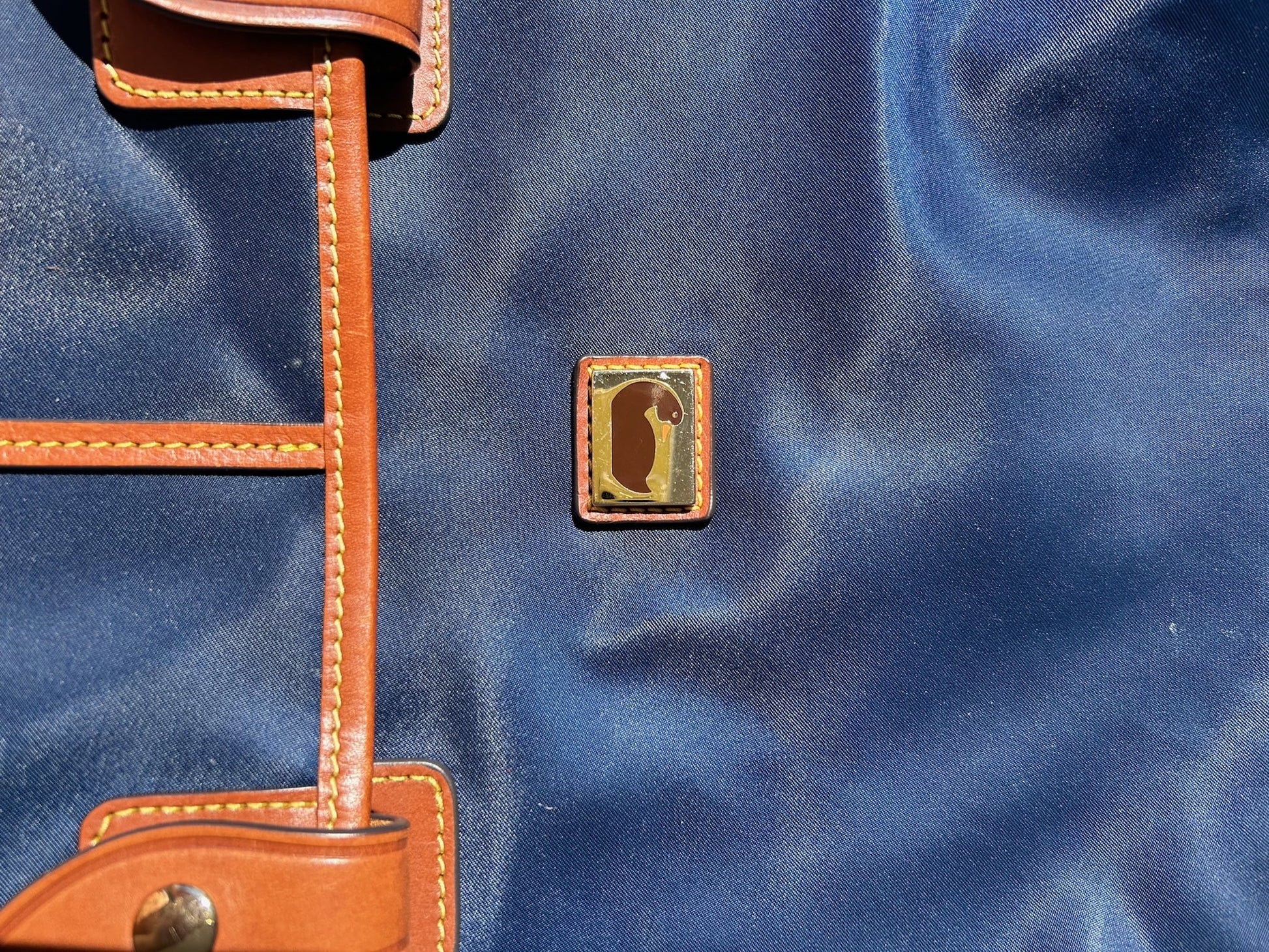 Stylish navy blue women's bag with elegant leather trim. This Dooney & Bourke bag is crafted from nylon , this set offers both elegance and functionality. This item is in good used condition with minor signs of wear consistent with its age. Any notable flaws will be detailed in this description, and any additional call outs if any, can be seen in the provided photos. Please review all images carefully. Staining inside.