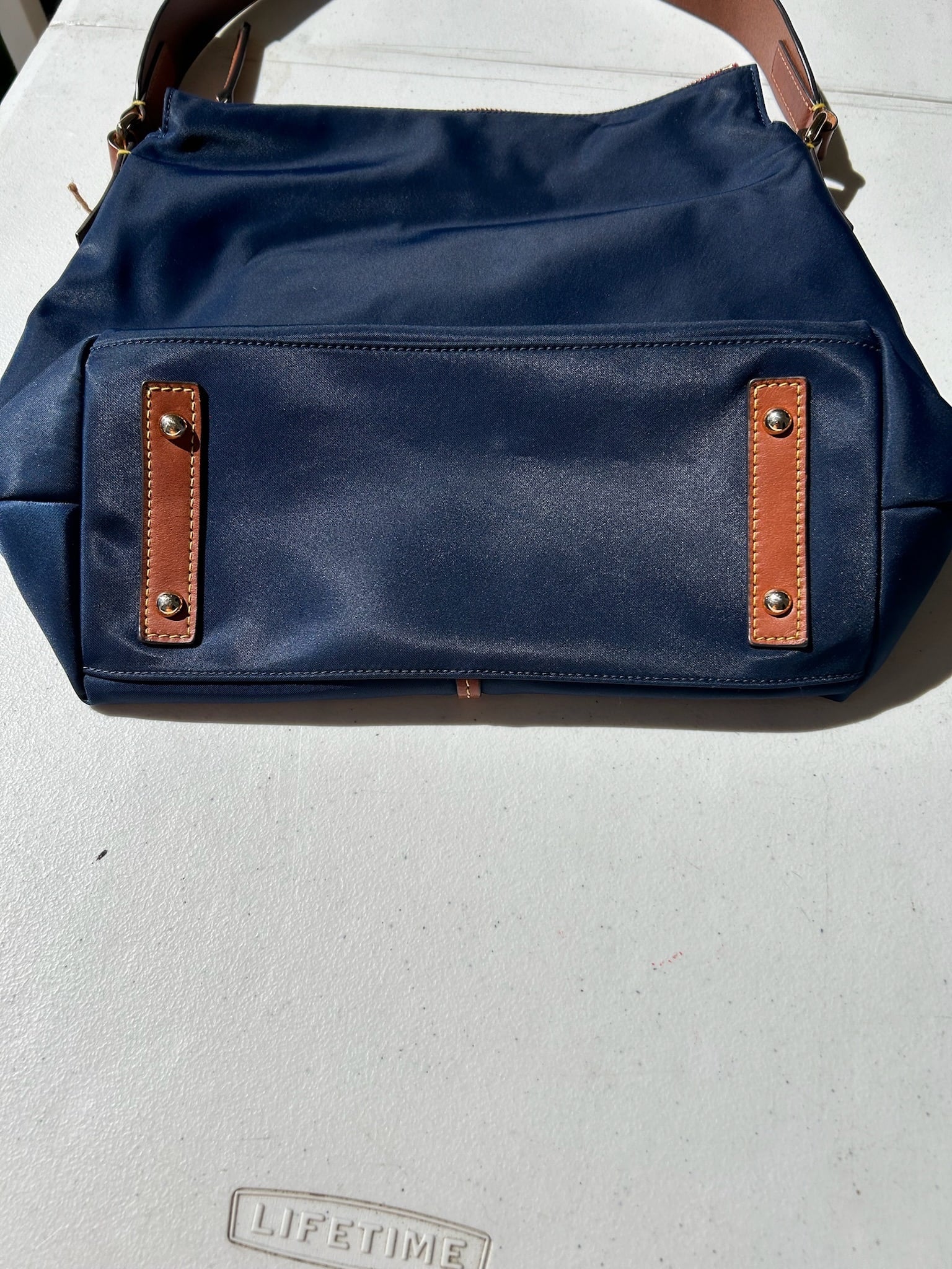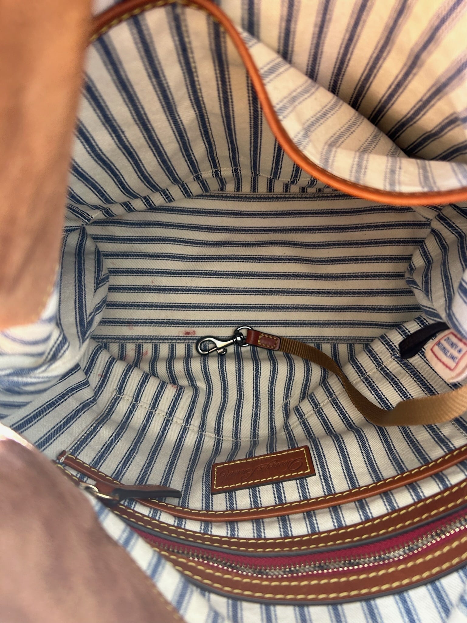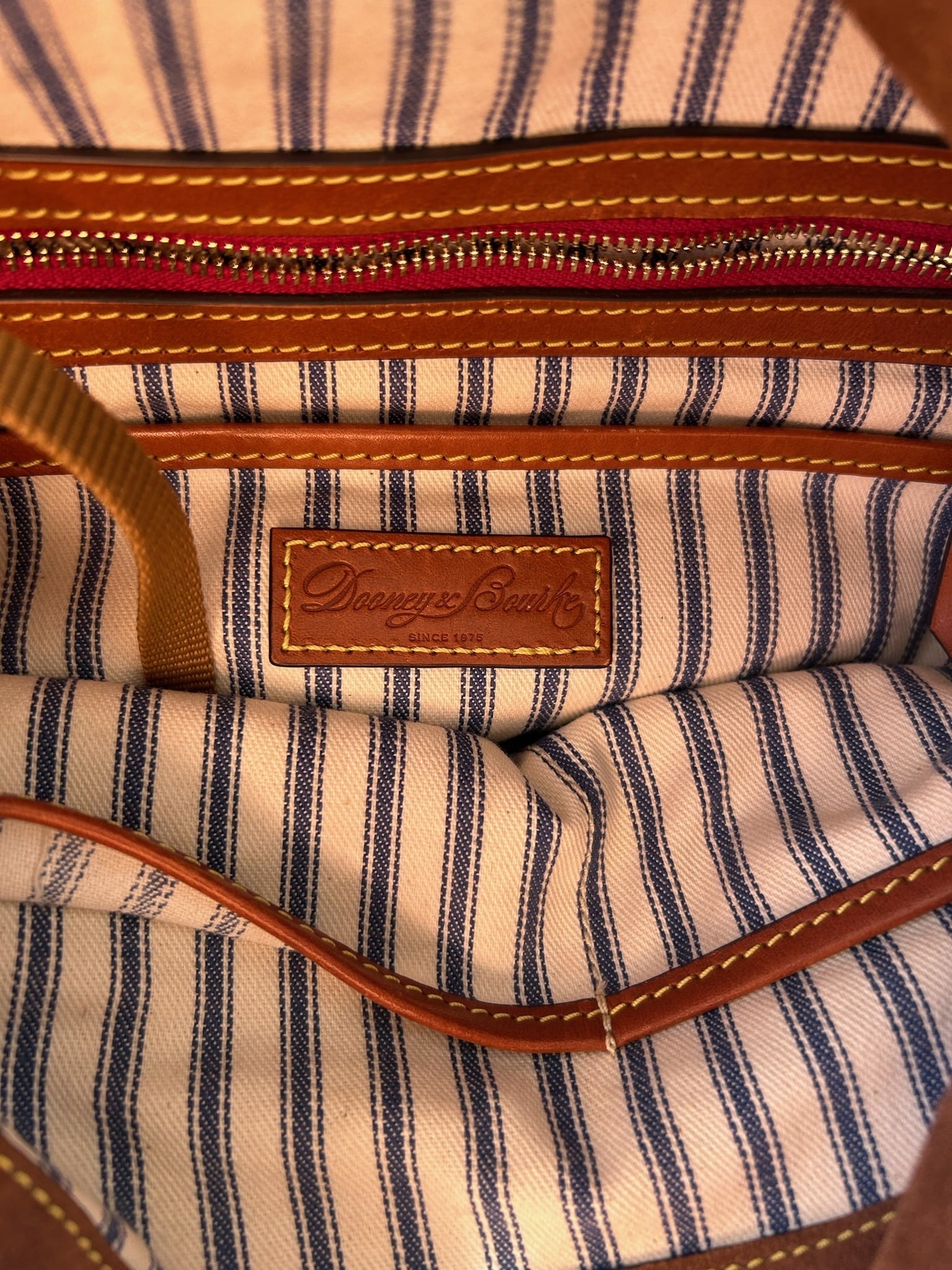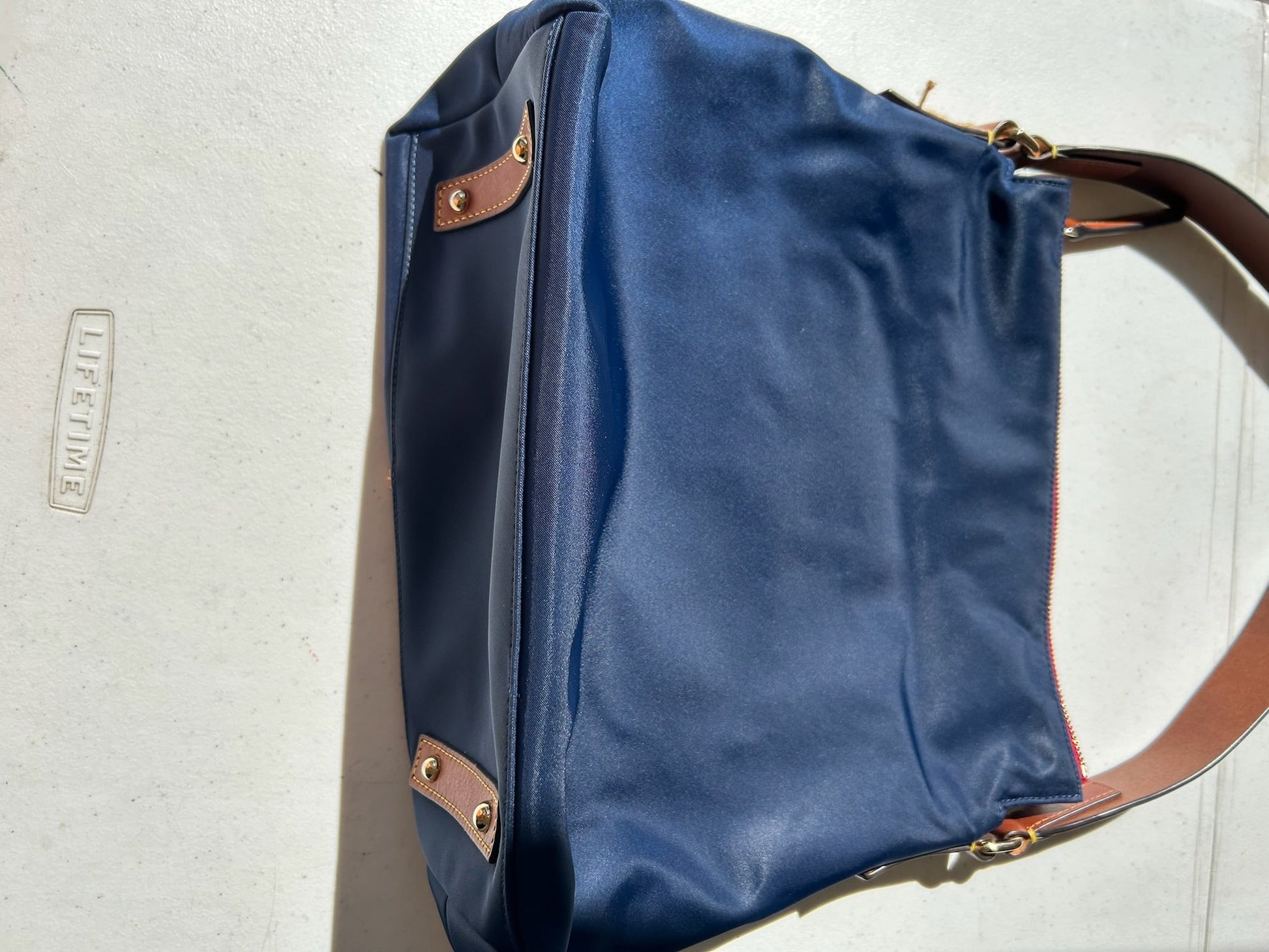 Stylish navy blue women's bag with elegant leather trim. This Dooney & Bourke bag is crafted from nylon , this set offers both elegance and functionality. This item is in good used condition with minor signs of wear consistent with its age. Any notable flaws will be detailed in this description, and any additional call outs if any, can be seen in the provided photos. Please review all images carefully. Staining inside.