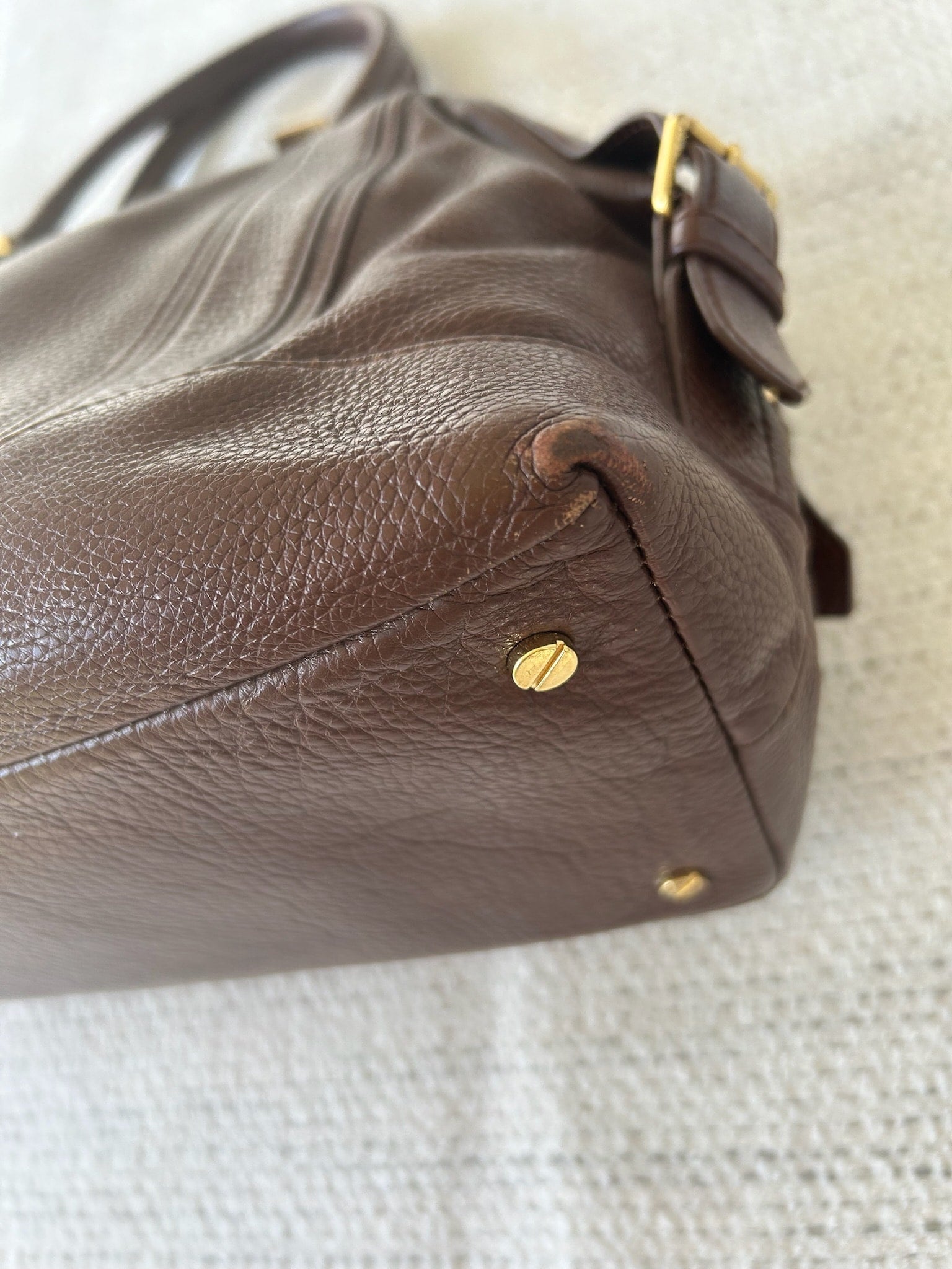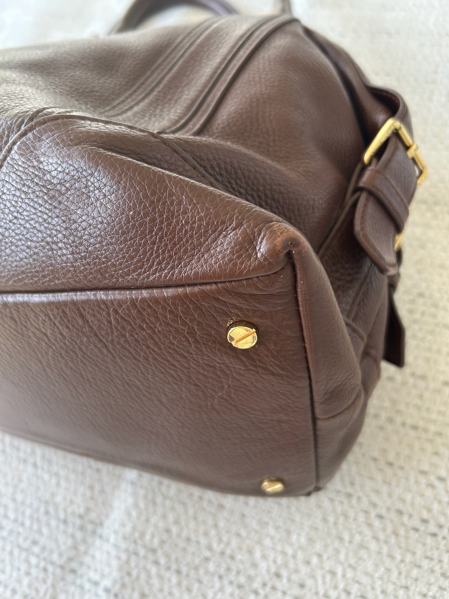 This item is in good used condition with minor signs of wear consistent with its age. Any notable flaws will be detailed in this description, and any additional call outs if any, can be seen in the provided photos. Please review all images carefully. Wear can be seen at corners, inside of bag has stains and ink marks. Bag has been cleaned and conditioned, stains remain.