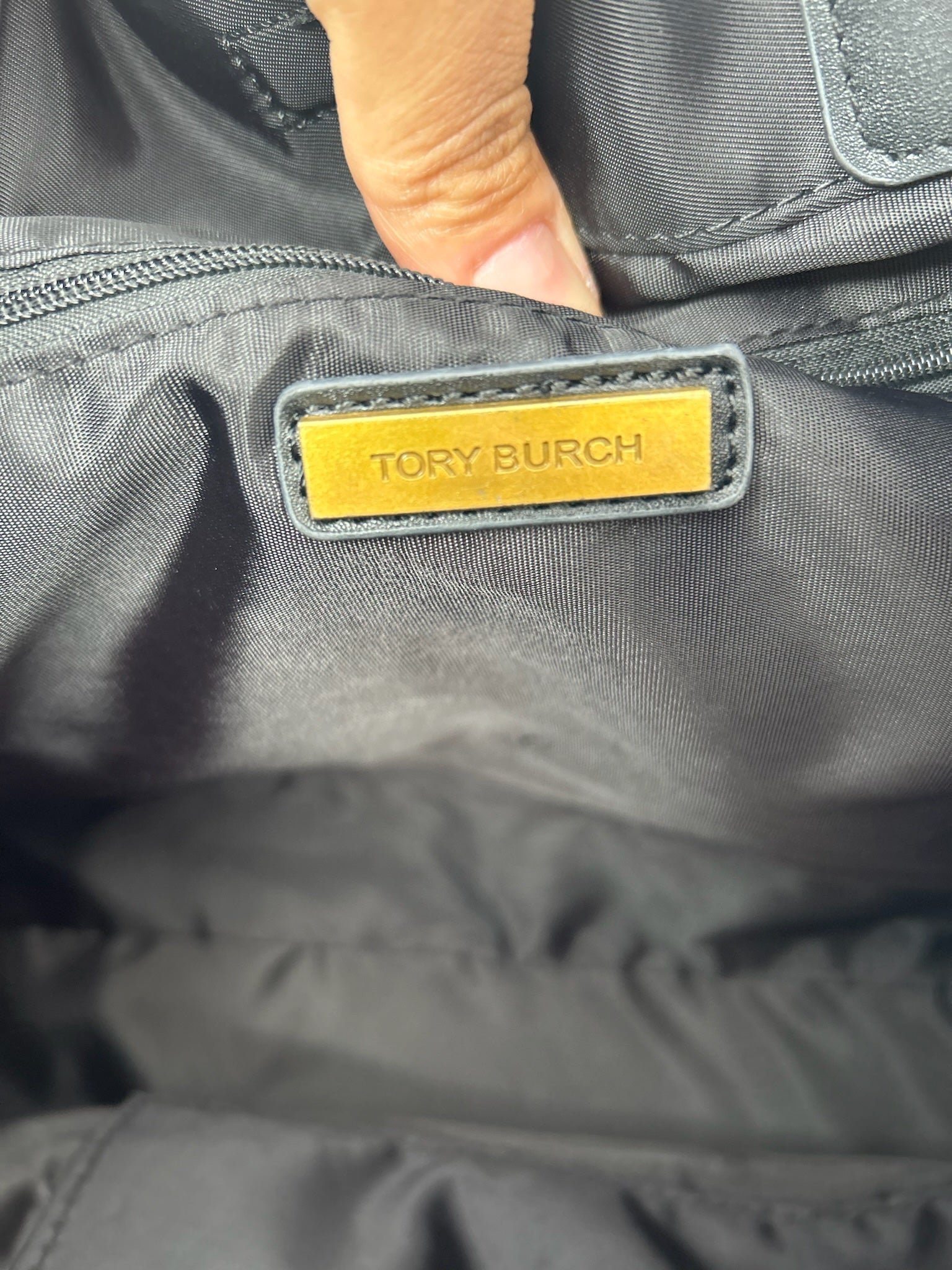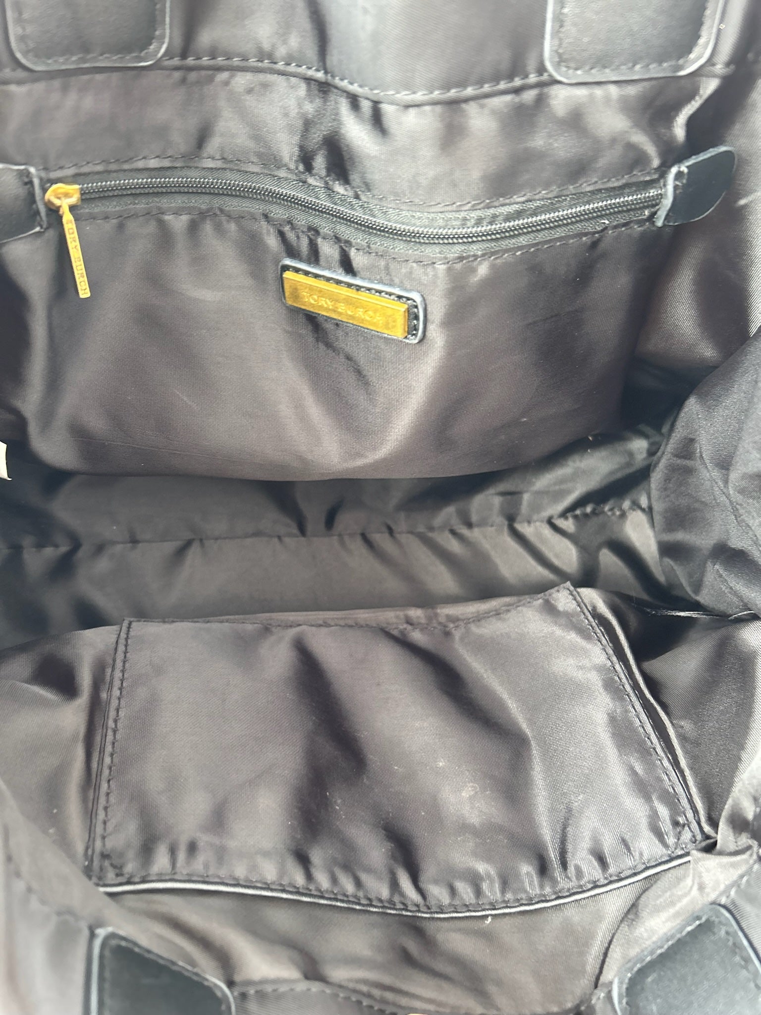 Ella small black tote. Edging on handles has come off, see pics. Inside is clean, outside in good condition. Holds an 11" laptop Recycled nylon; lining: recycled polyester Magnetic and gusset snap closure PU leather top handles with 7.4" drop 1 interior zipper pocket, 1 slit pocket Height: 10.6"; length: 13.6"; depth: 4.4"