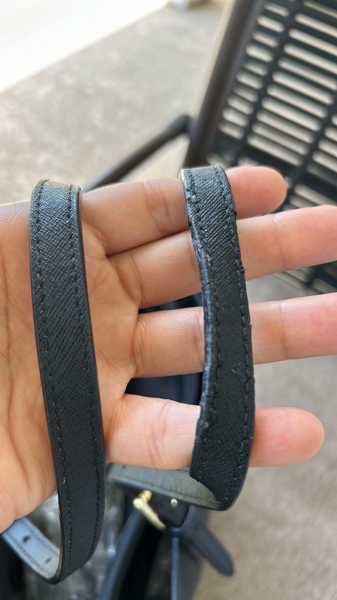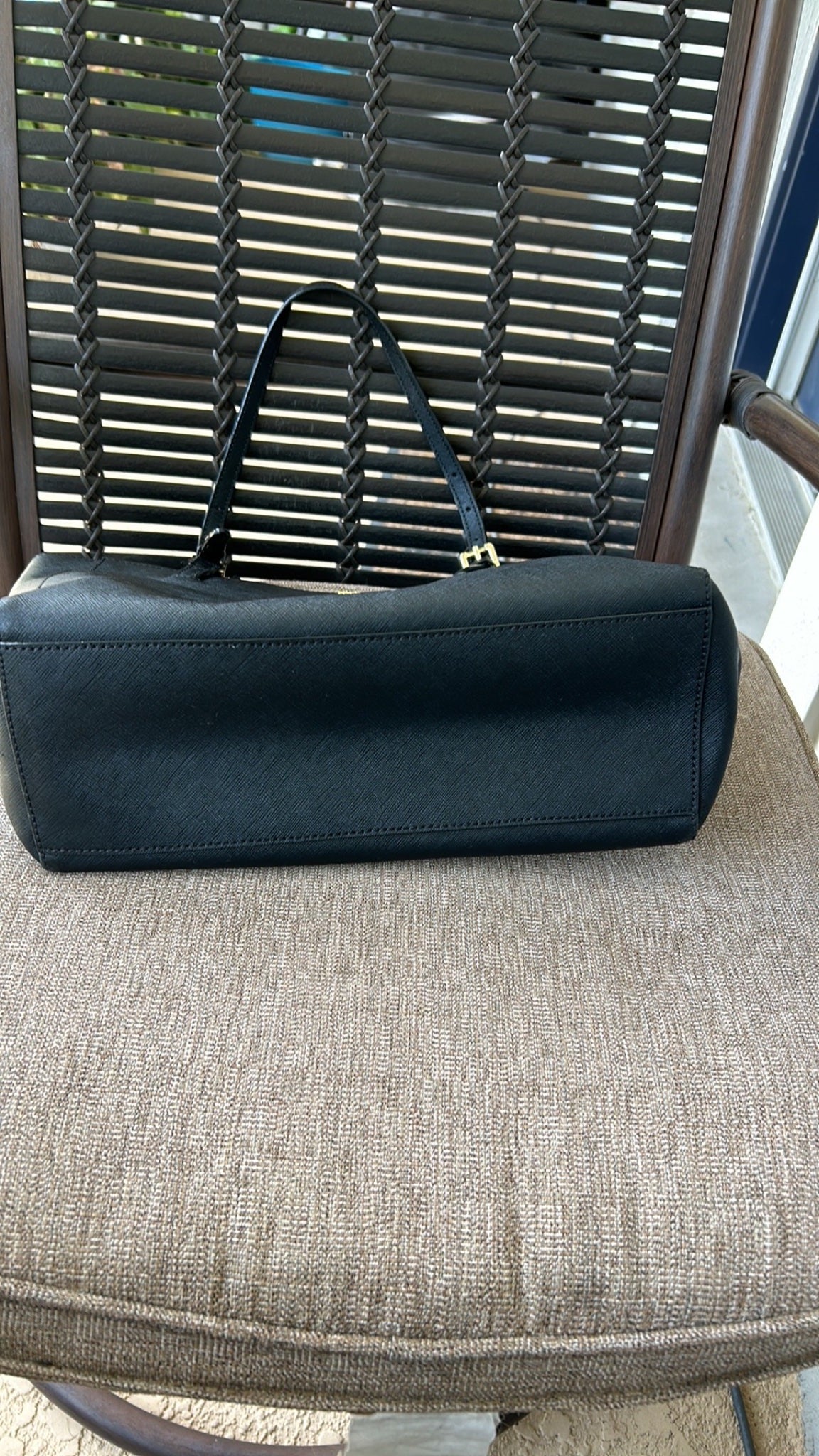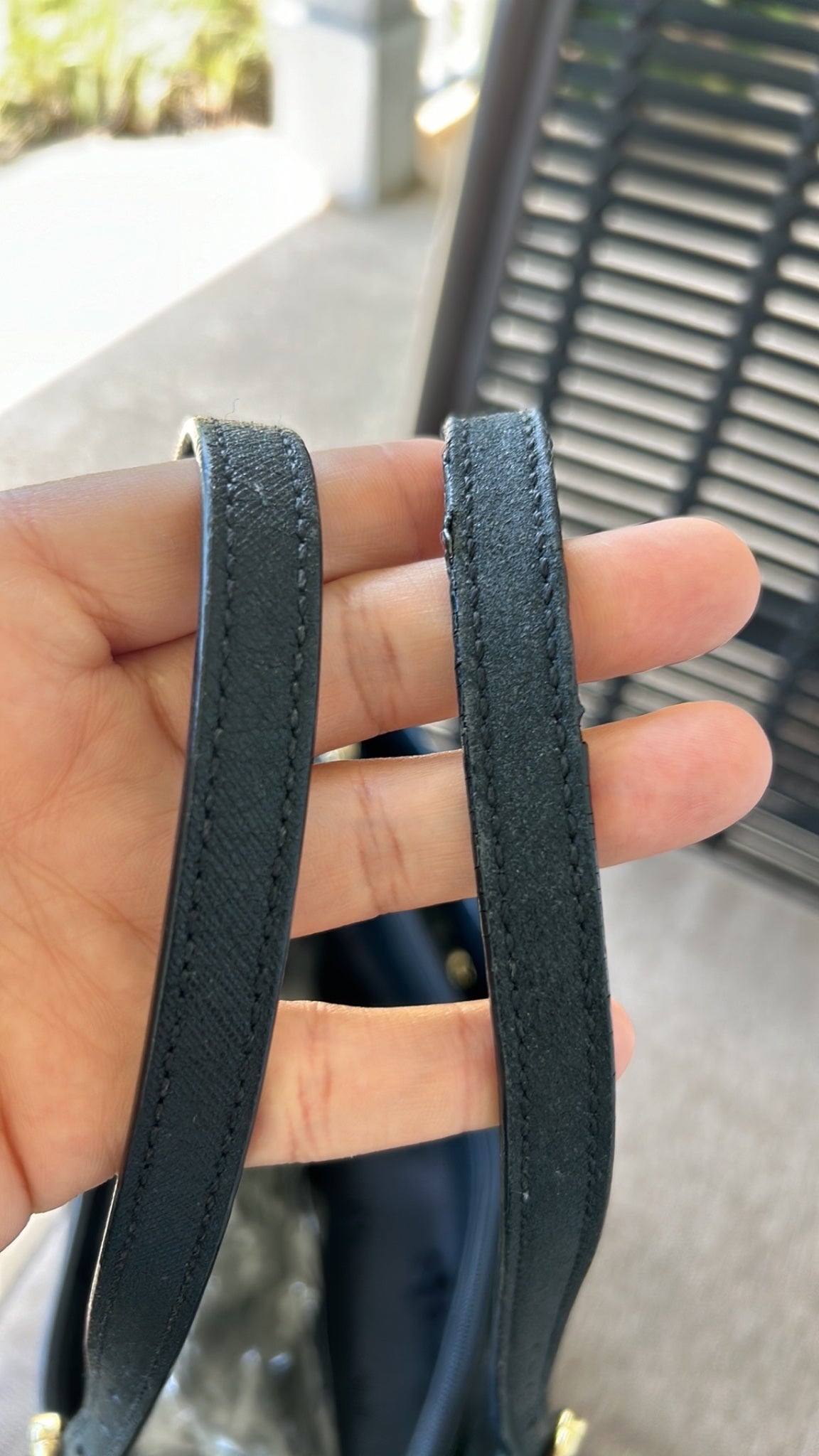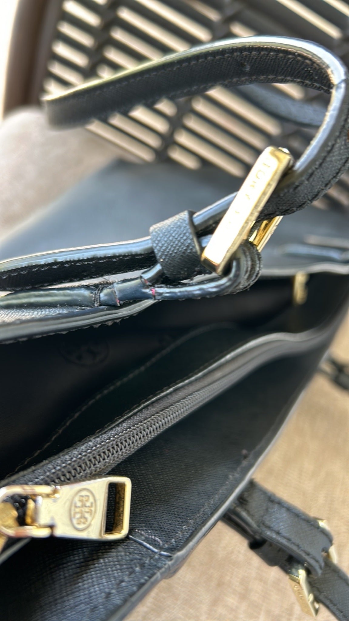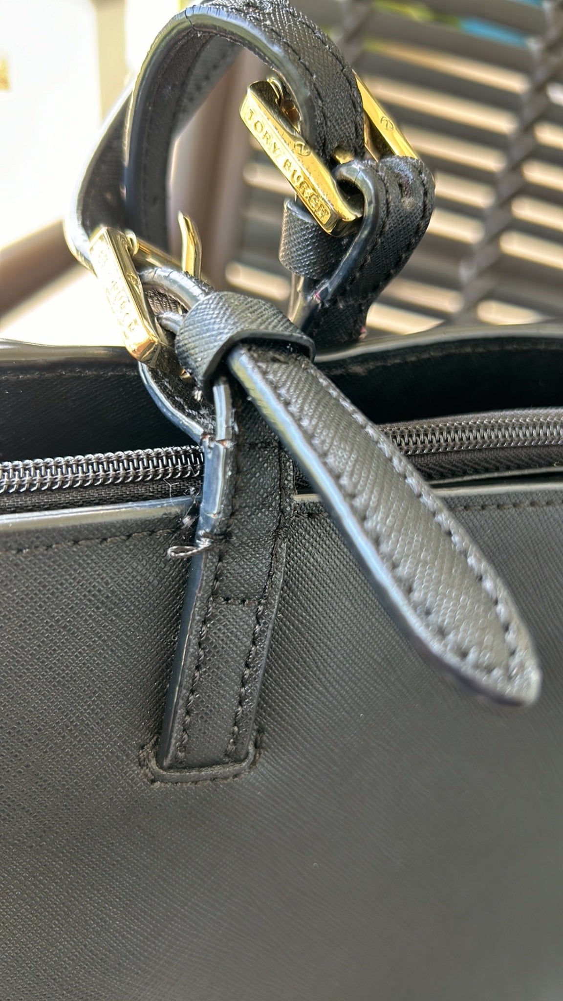 Tory Burch bag. Bag is previously loved, bag has standard wear from use. Where can be seen on handles there is cracking and bruising, see pics. Corners of bag are good, inside a bag is clean. See pics.